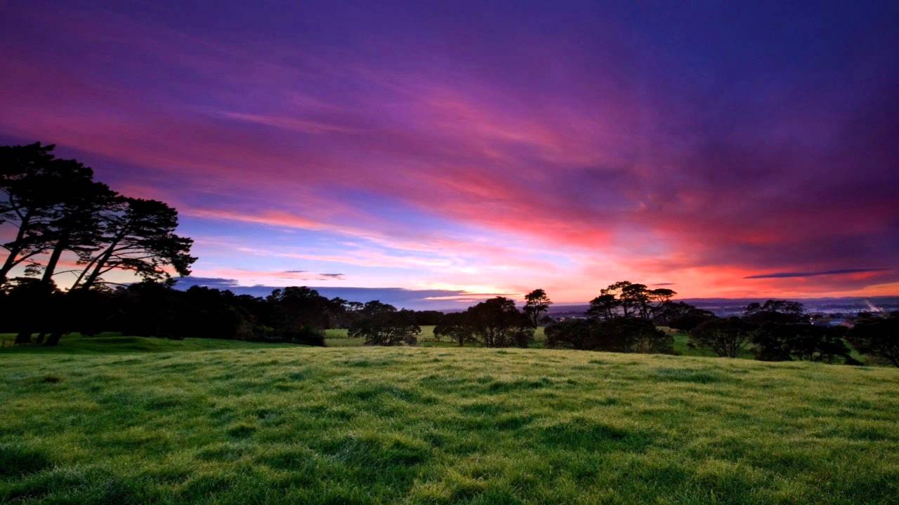 Description: A field with trees and a sunset in the background with clouds in the sky and a purple sky with a few clouds.