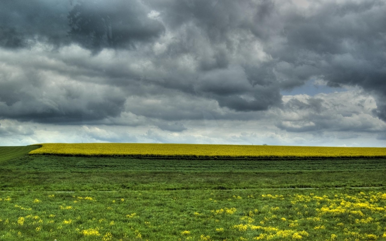 Description: A field with a few yellow flowers under a cloudy sky with a lone tree in the distance on the far side.