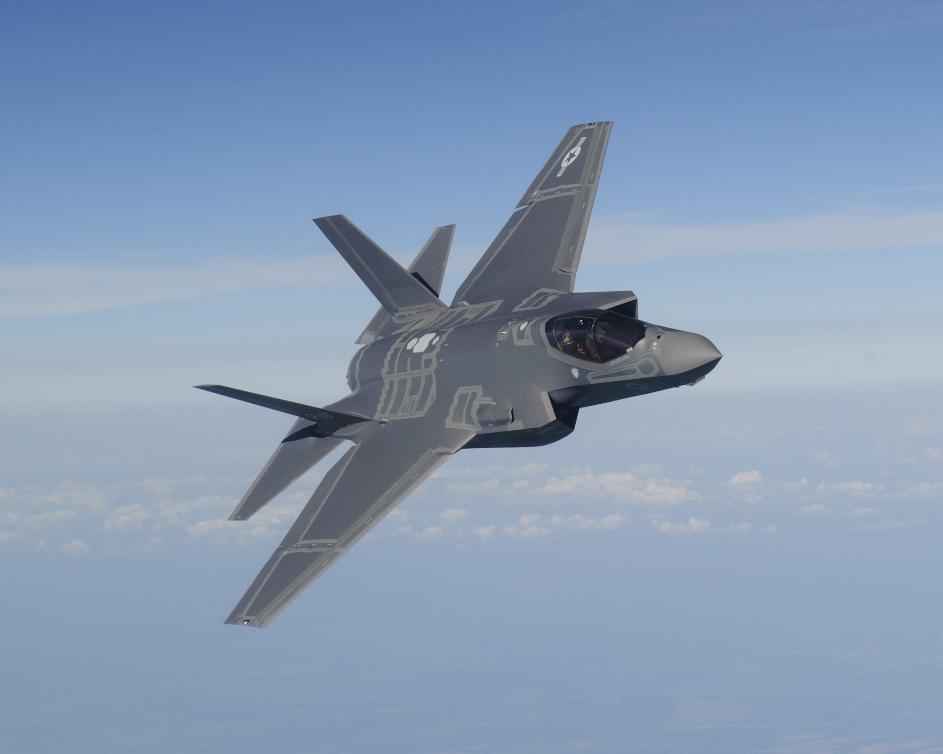 Description: A fighter jet flying through a blue sky with clouds below it and a pilot inside the cockpit of the jet.