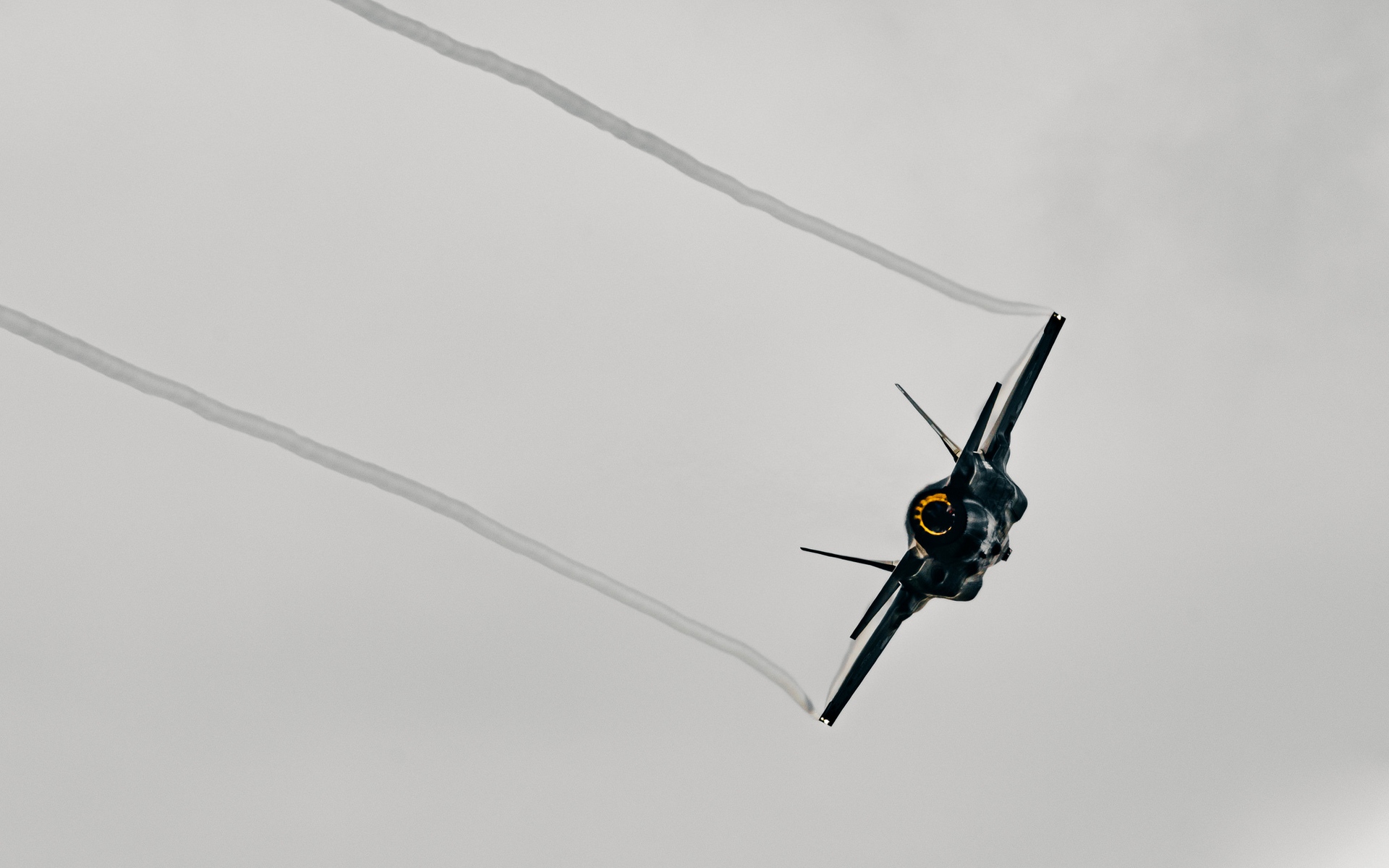 Description: A fighter jet flying through a cloudy sky with two contrails in the sky behind it and a jet flying in the air.