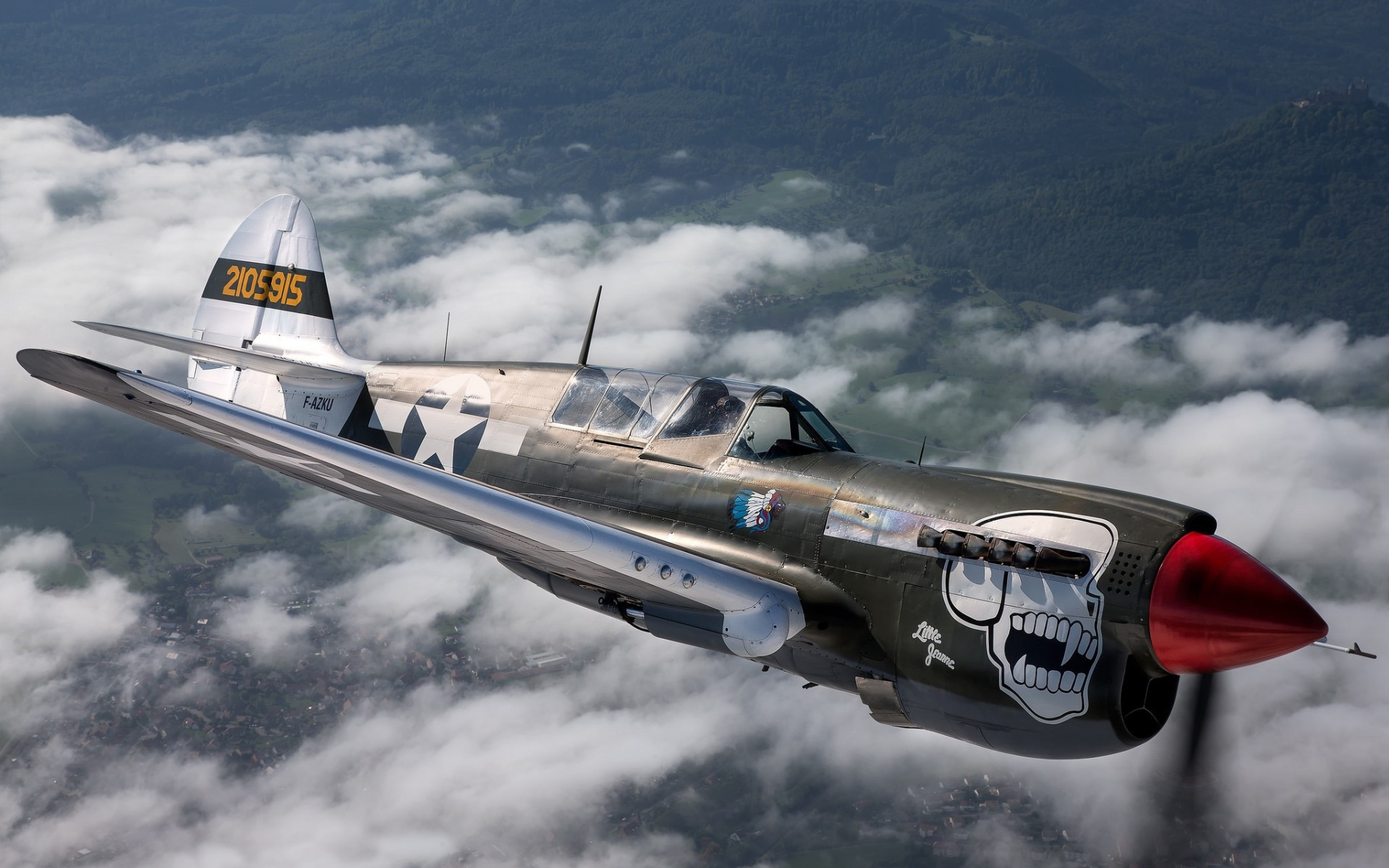 Description: A fighter jet flying through the sky above clouds and mountains in the background is a mountain range and a valley.