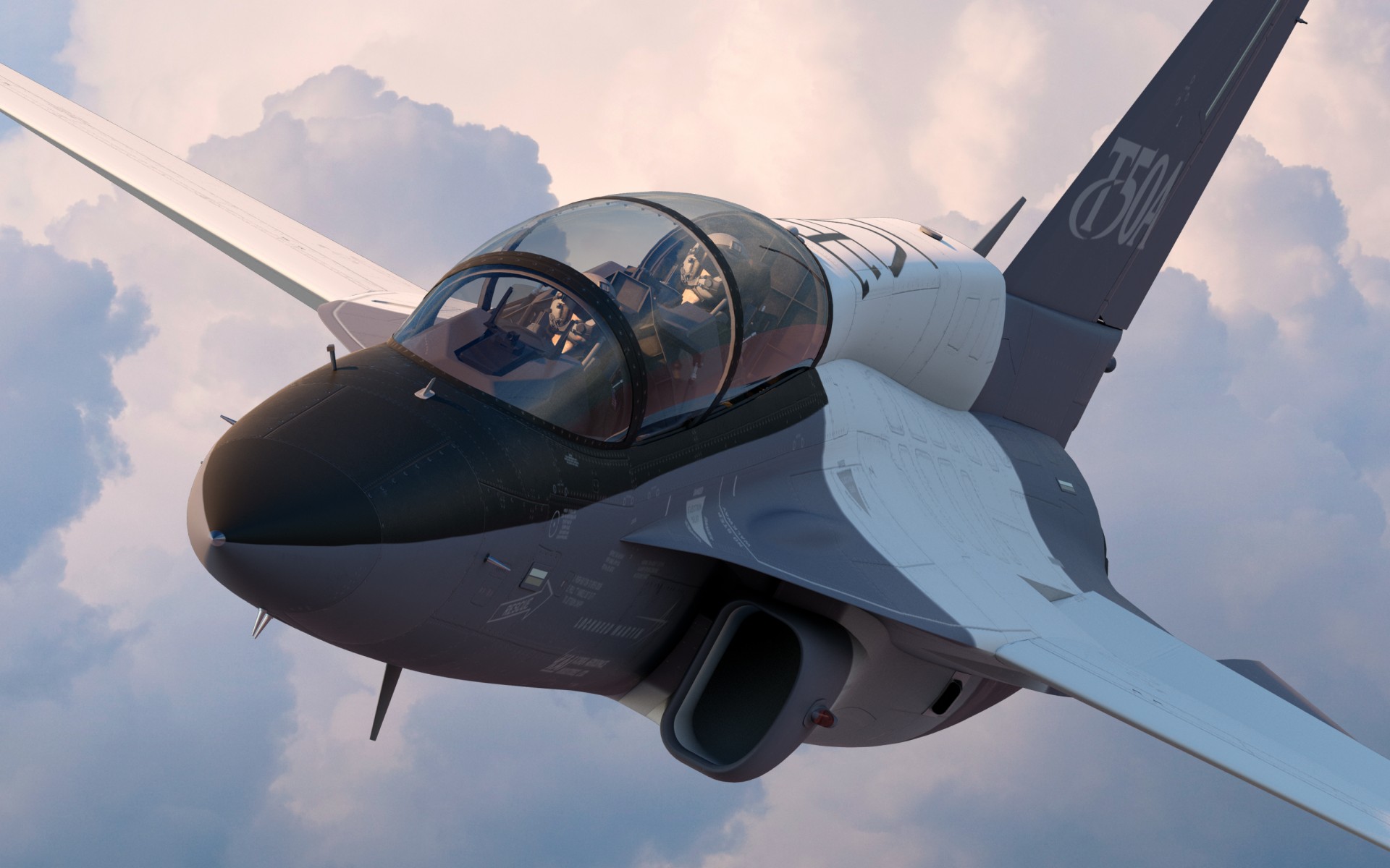 Description: A fighter jet flying through a cloudy sky with a pilot in the cockpit window of it's jet.