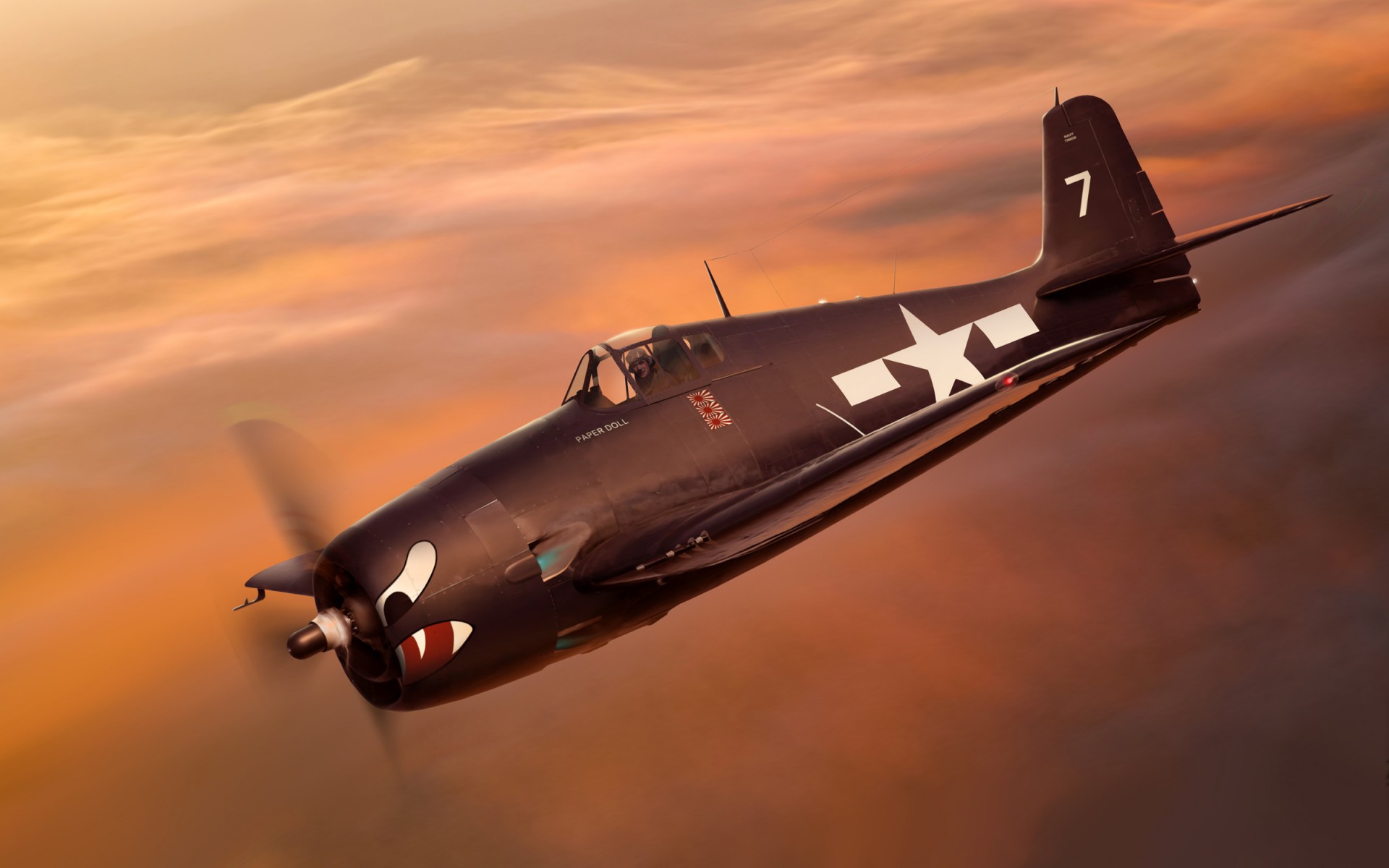 Description: A fighter jet flying through a cloudy sky at sunset or dawn with a star on the side of the wing.