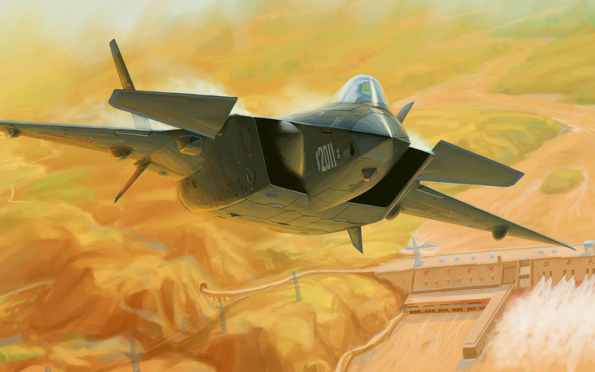 Description: A painting of a fighter jet flying over a desert landscape with a bridge in the foreground and a yellow sky.