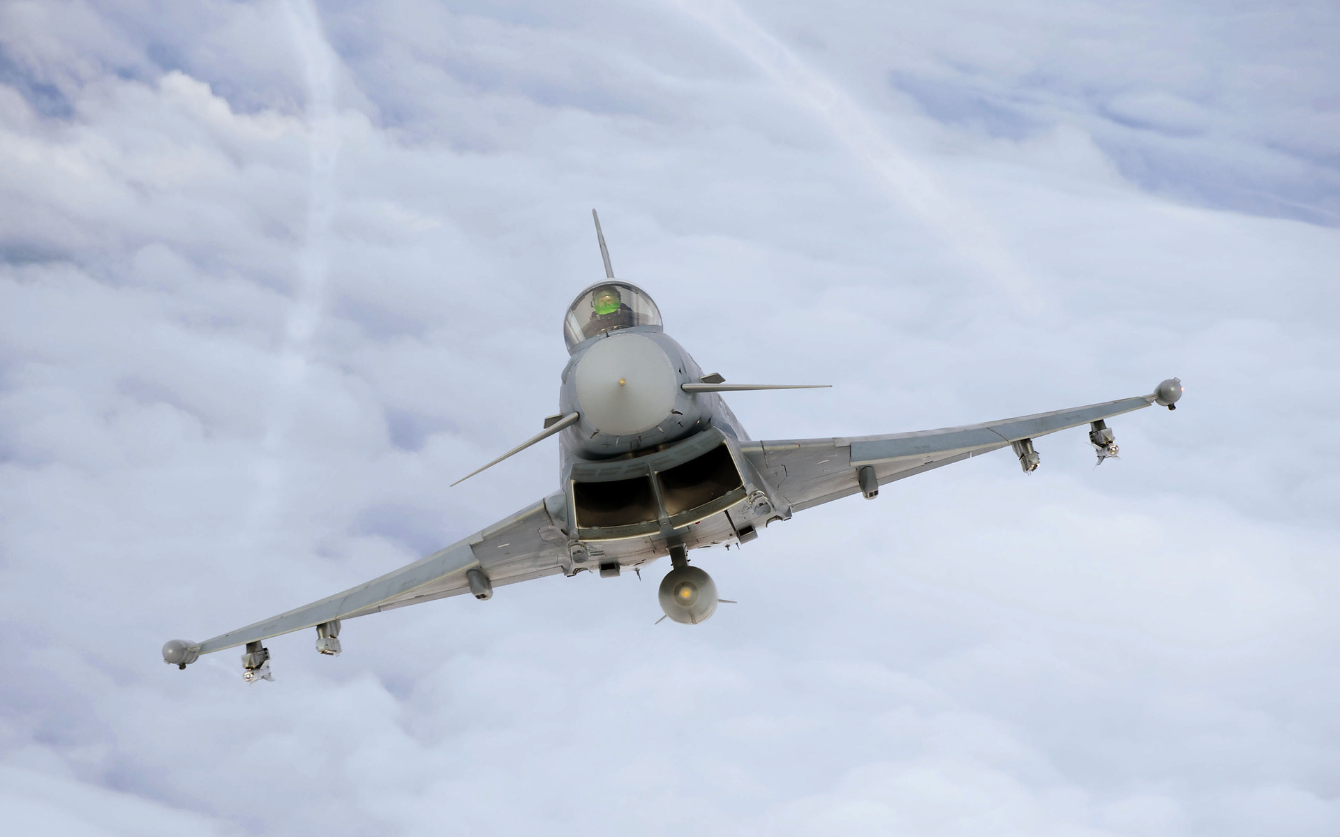 Description: A fighter jet flying through the air above clouds in the sky with a jet engine on the side of the jet.