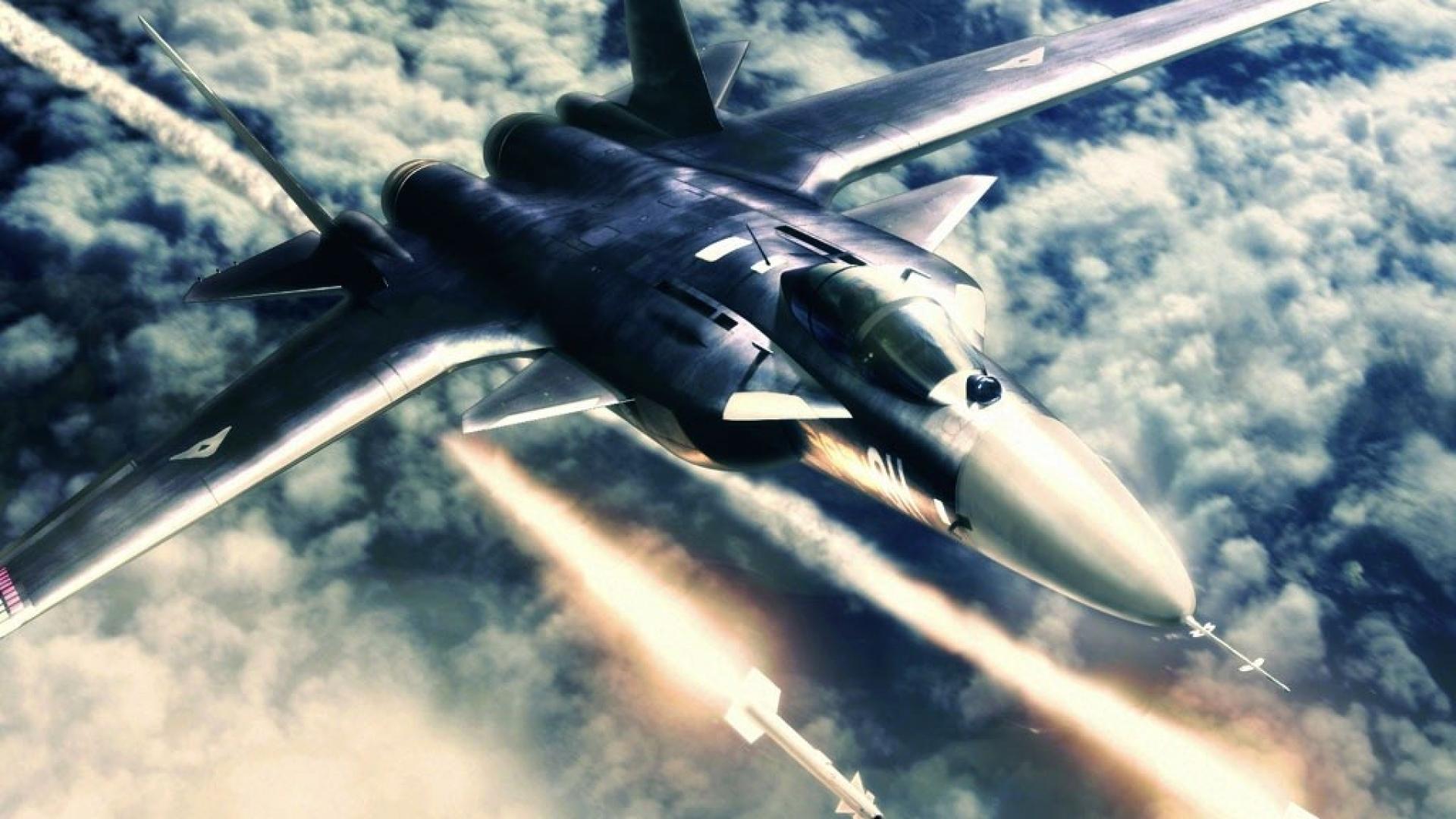 Description: A fighter jet flying through the air with a sky background full of clouds and smoke behind it and a flag flying in the air.
