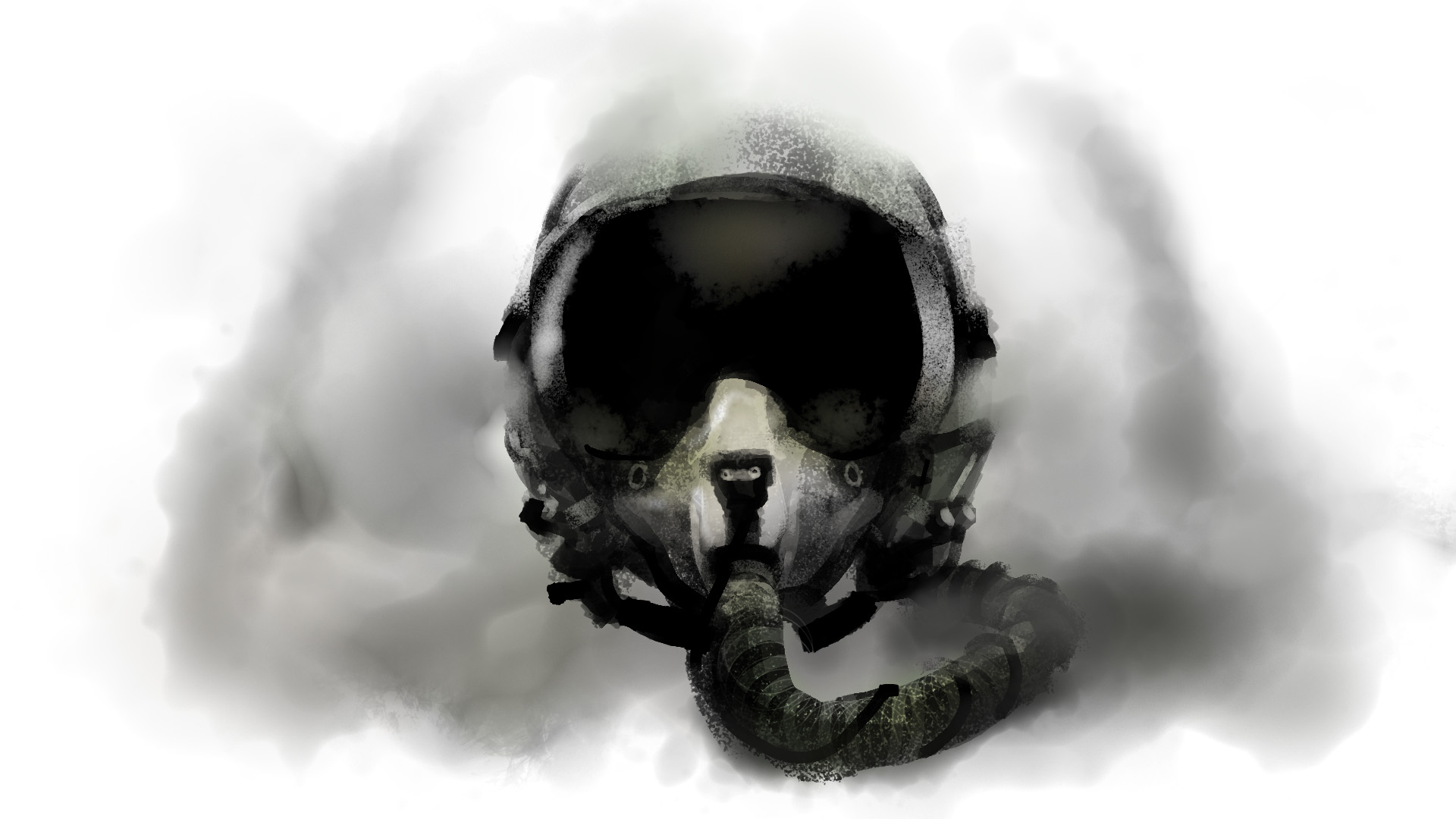 Description: A digital painting of a fighter jet pilot's helmet and goggles with smoke coming out of the side.
