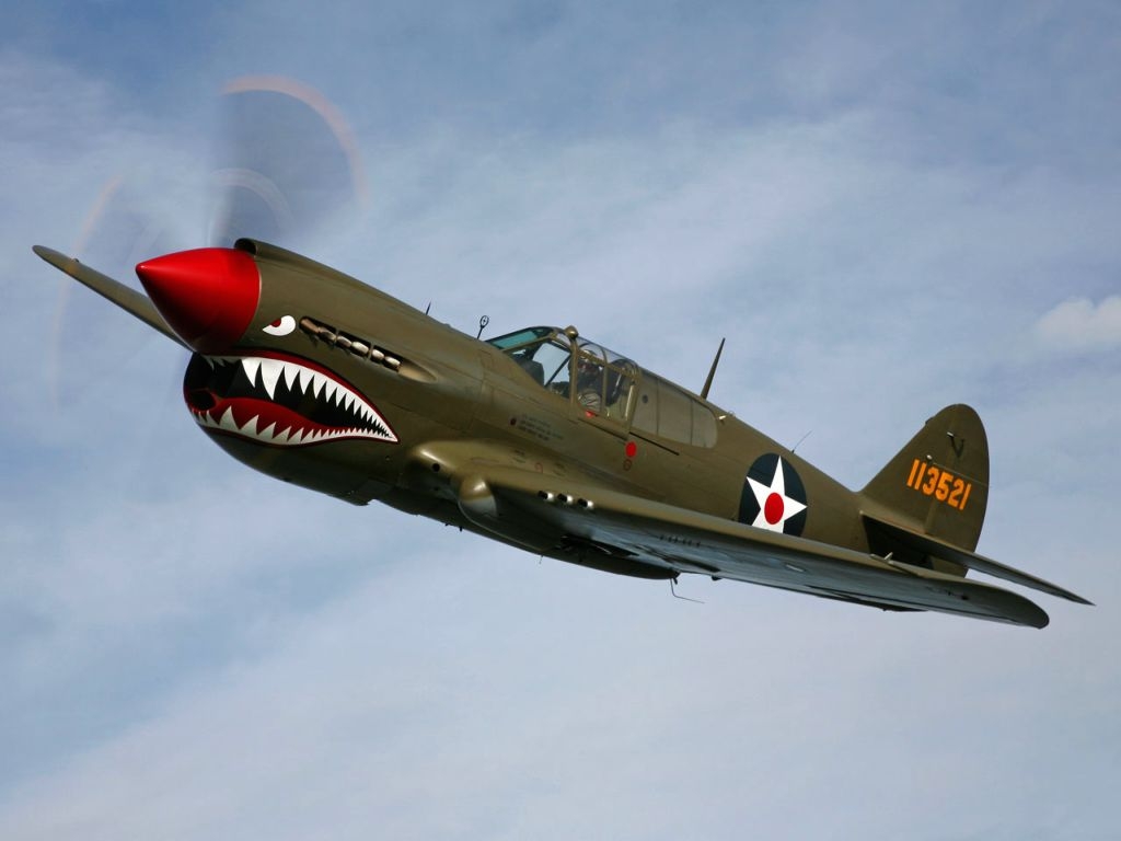 Description: A fighter jet with a shark's mouth painted on it's side flying in the sky with a blue sky background.