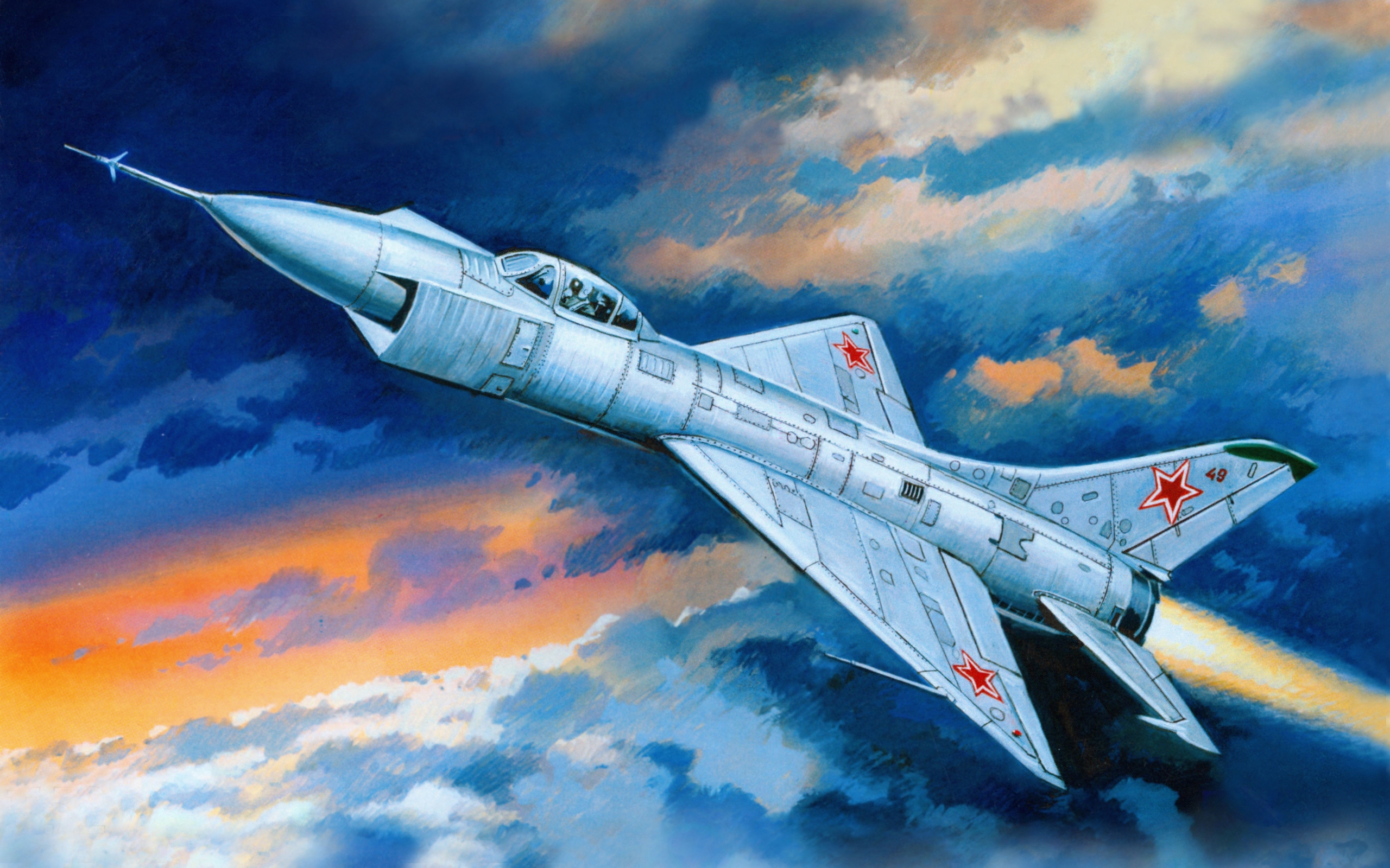 Description: A painting of a fighter jet flying through the sky with a red star on its tail and a yellow star on its tail.