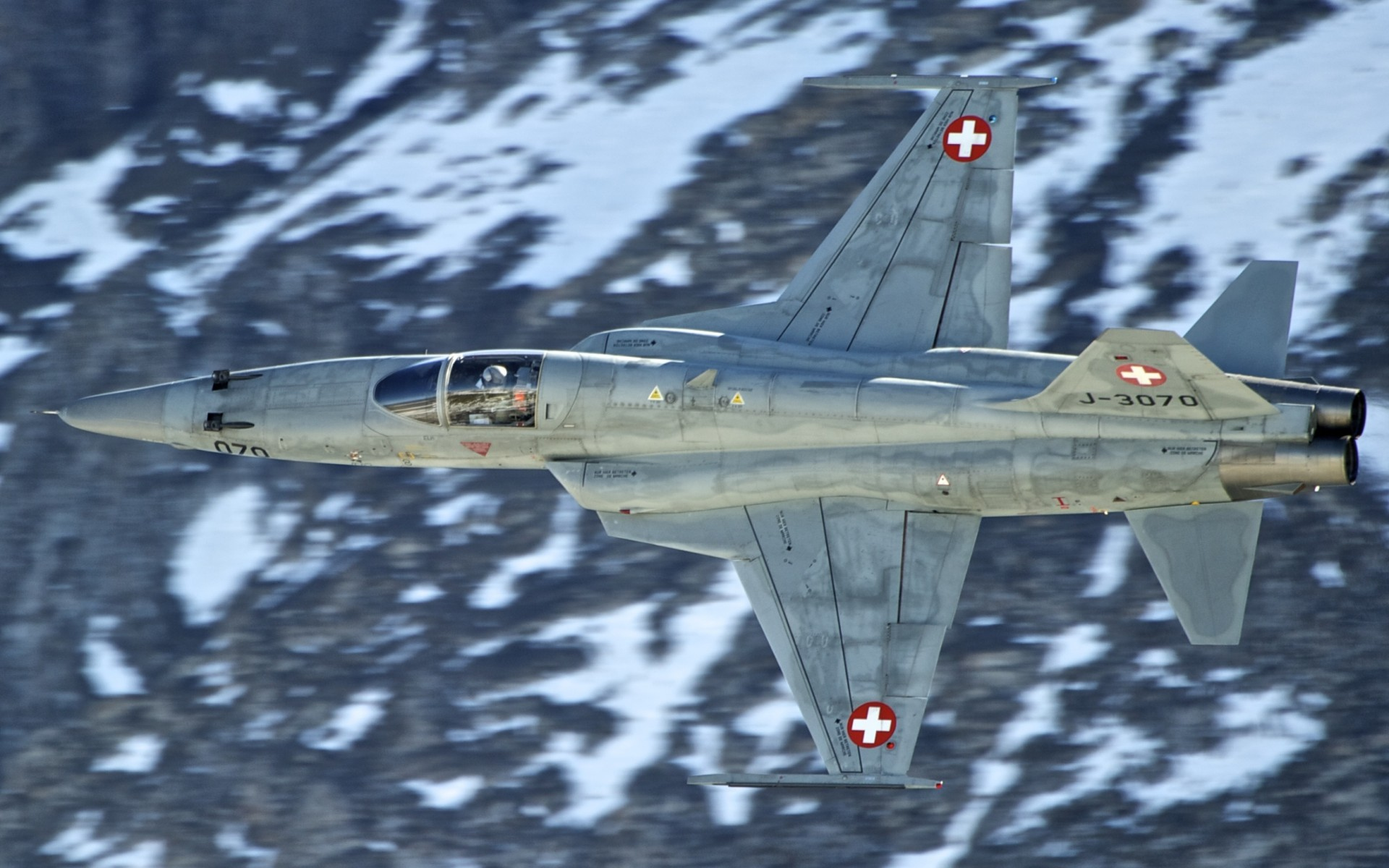 Description: A fighter jet flying over a mountain range in the snow with a swiss cross on the side of it.