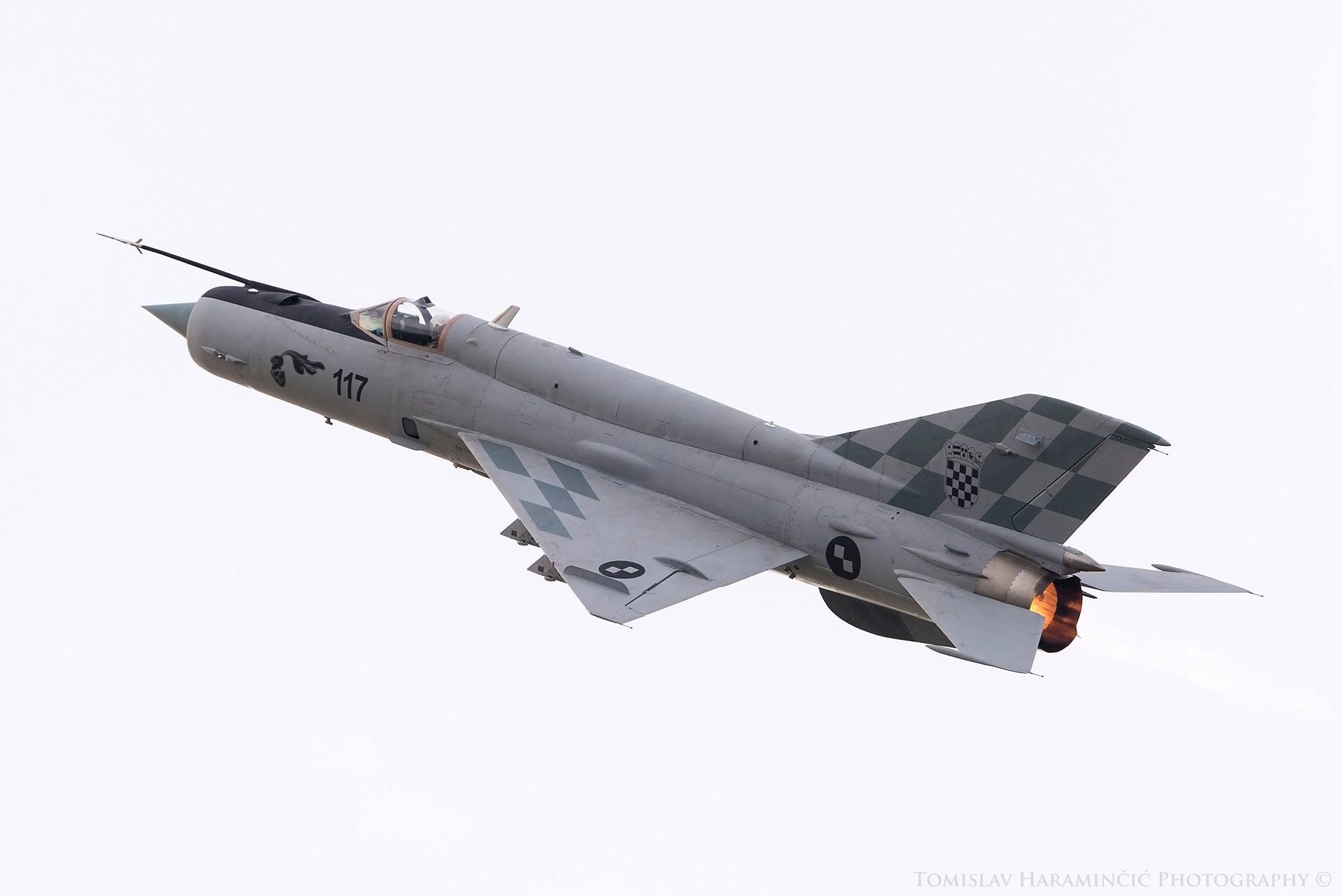 Description: A fighter jet flying through a white sky with checkered design on the side of it's wings.