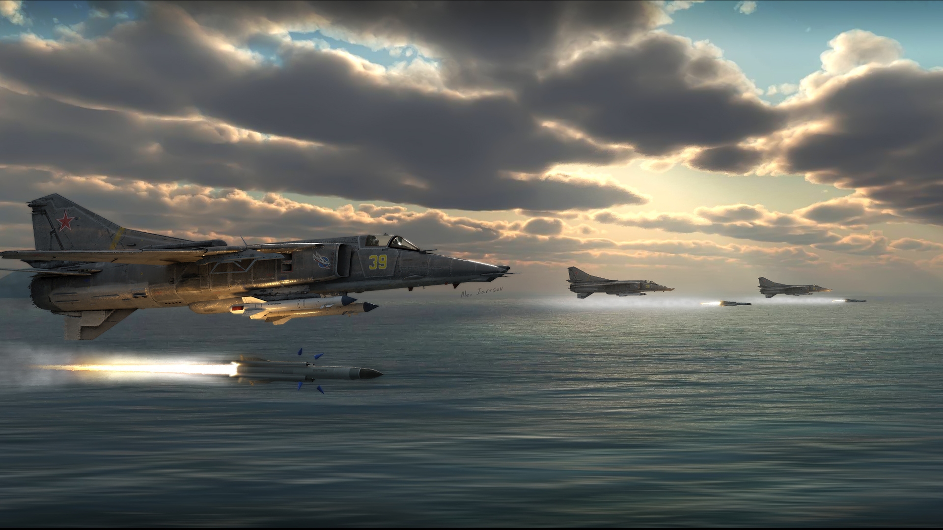 Description: A group of fighter jets flying over the ocean under a cloudy sky with a jet fighter in the foreground.