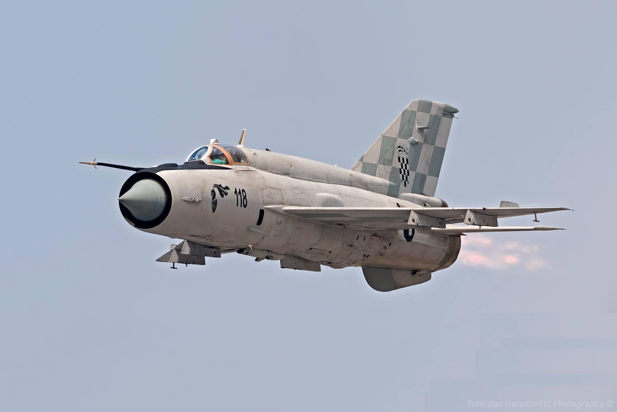 Description: A fighter jet flying through a blue sky with a checkered tail and pilot in the cockpit looking out.