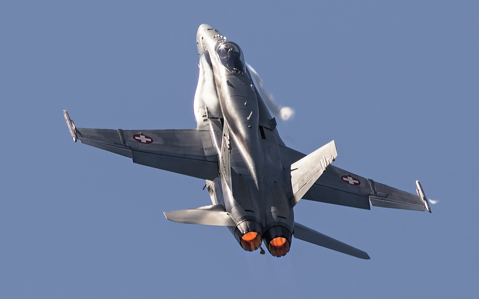 Description: A fighter jet flying through a blue sky with a few clouds in the background and a few orange balls in the bottom of the jet.