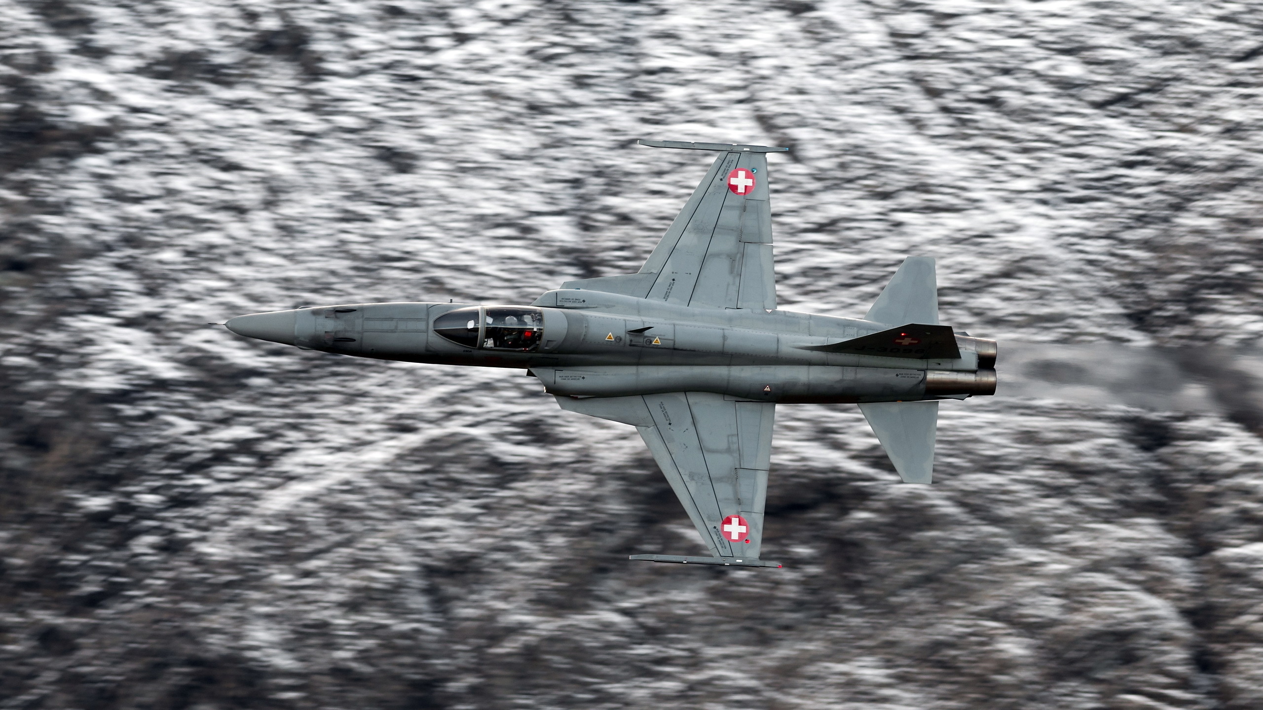 Description: A fighter jet flying over a mountain covered in snow and rocks.