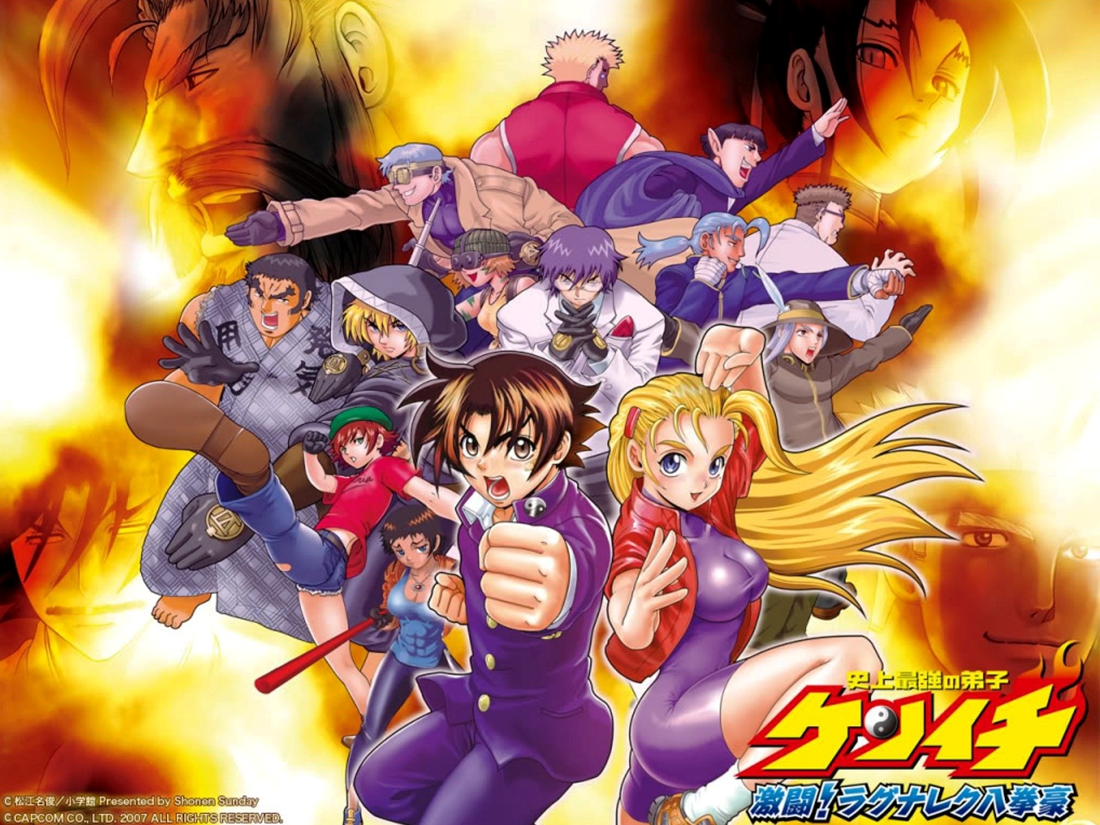 Description: A poster of a group of people in a movie with a fire background and a man pointing a gun.