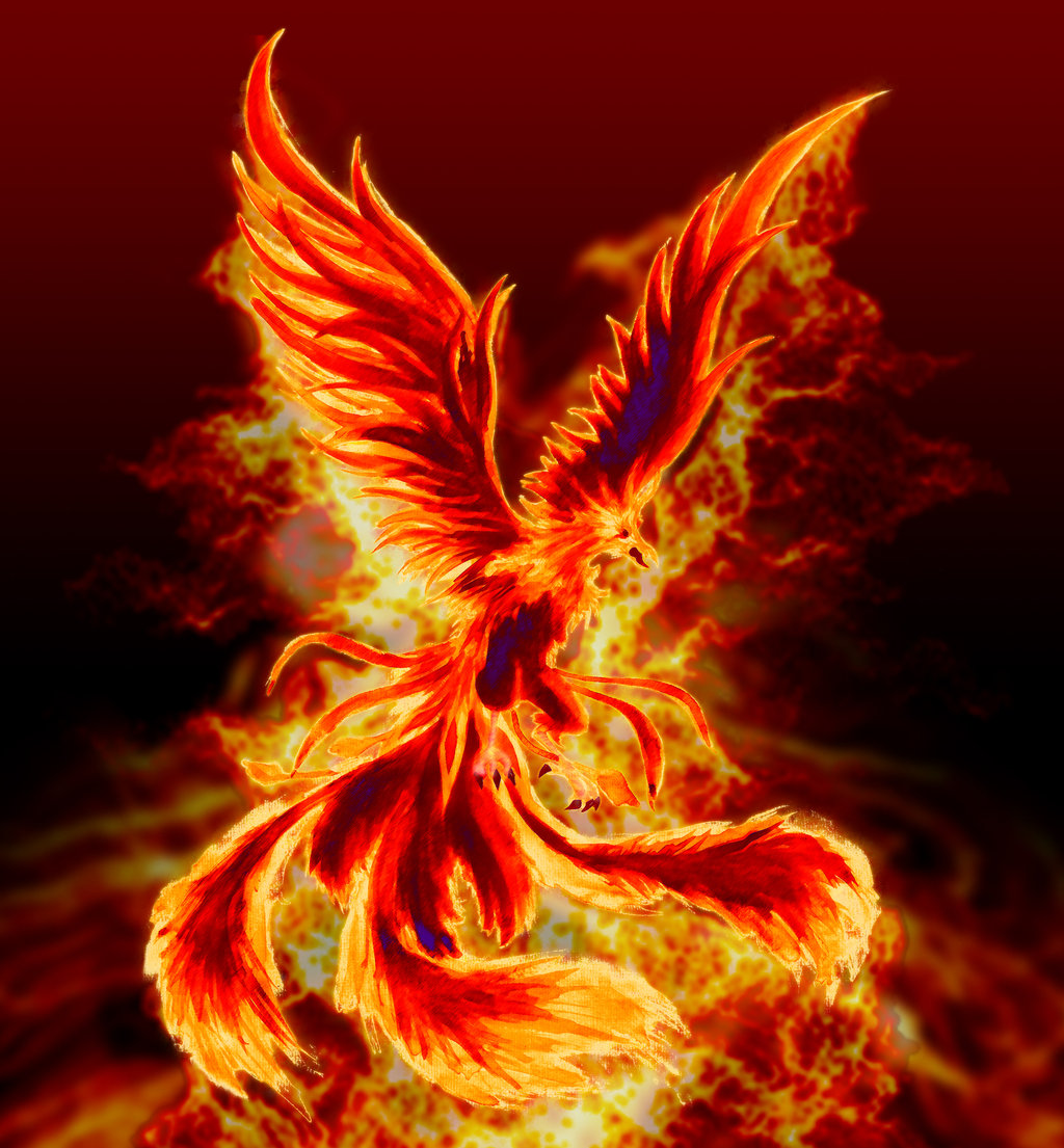 Description: A fire bird with orange and red feathers flying through the air with flames around it's wings and tail.