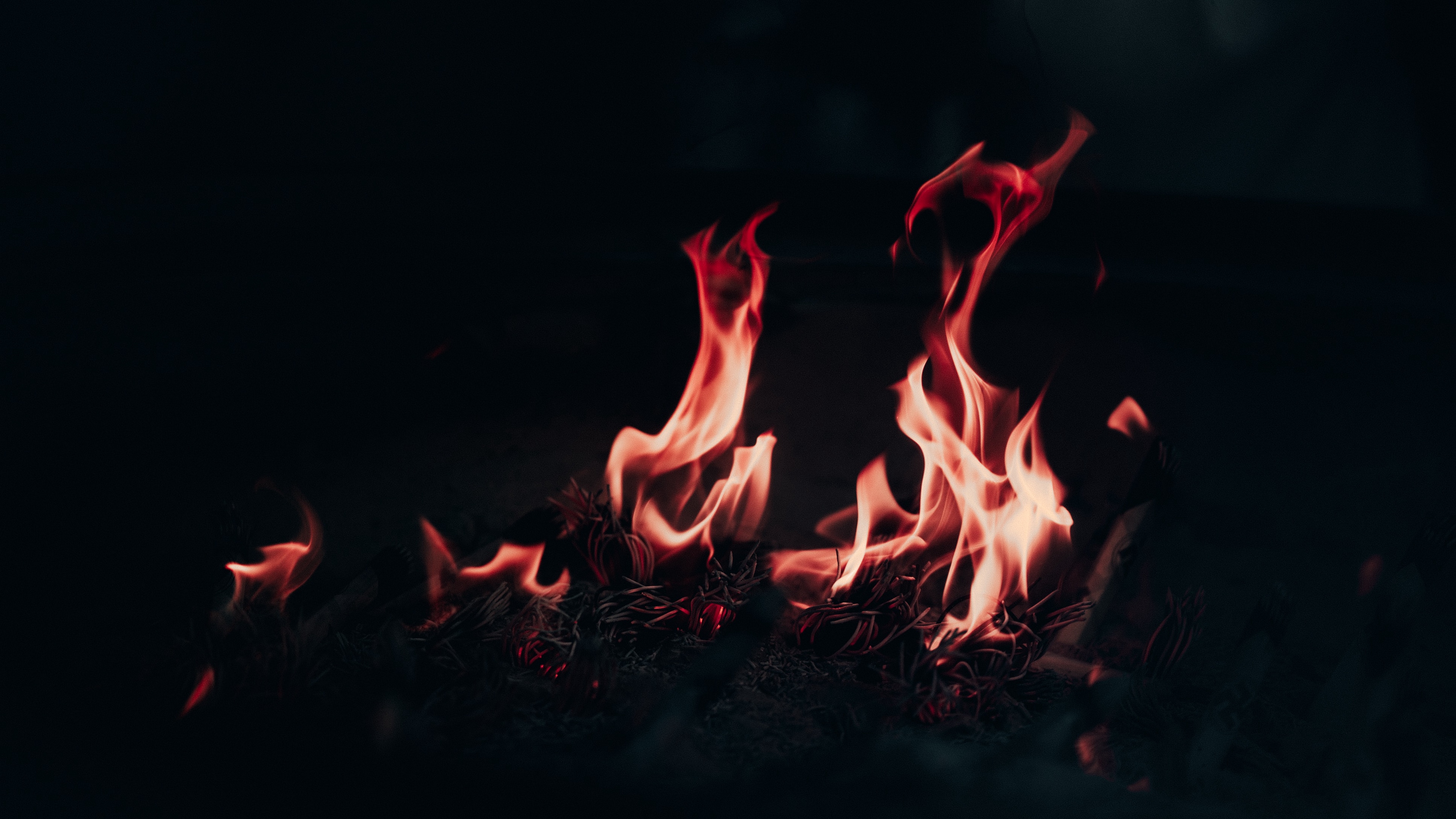 Description: A fire is burning in the dark with red flames on it's sides and red flames on the top of the flames.