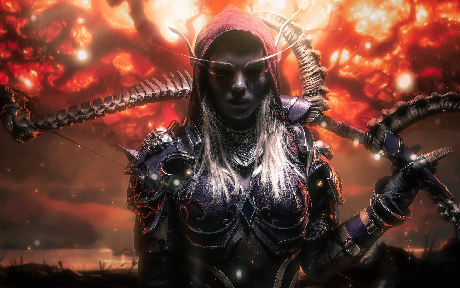 Description: A woman with a sword and a demon like outfit in front of a fire filled sky with flames and smoke.