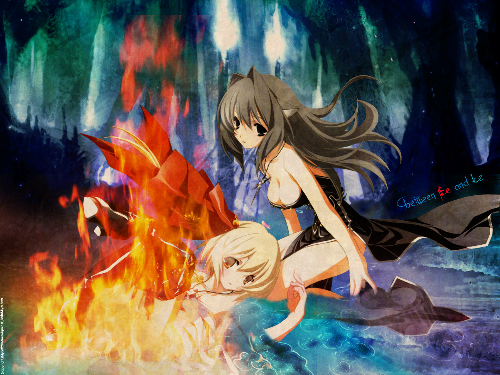 Description: A woman in a black dress is sitting on a fire with a sword in her hand and another woman in a black dress is standing behind her.