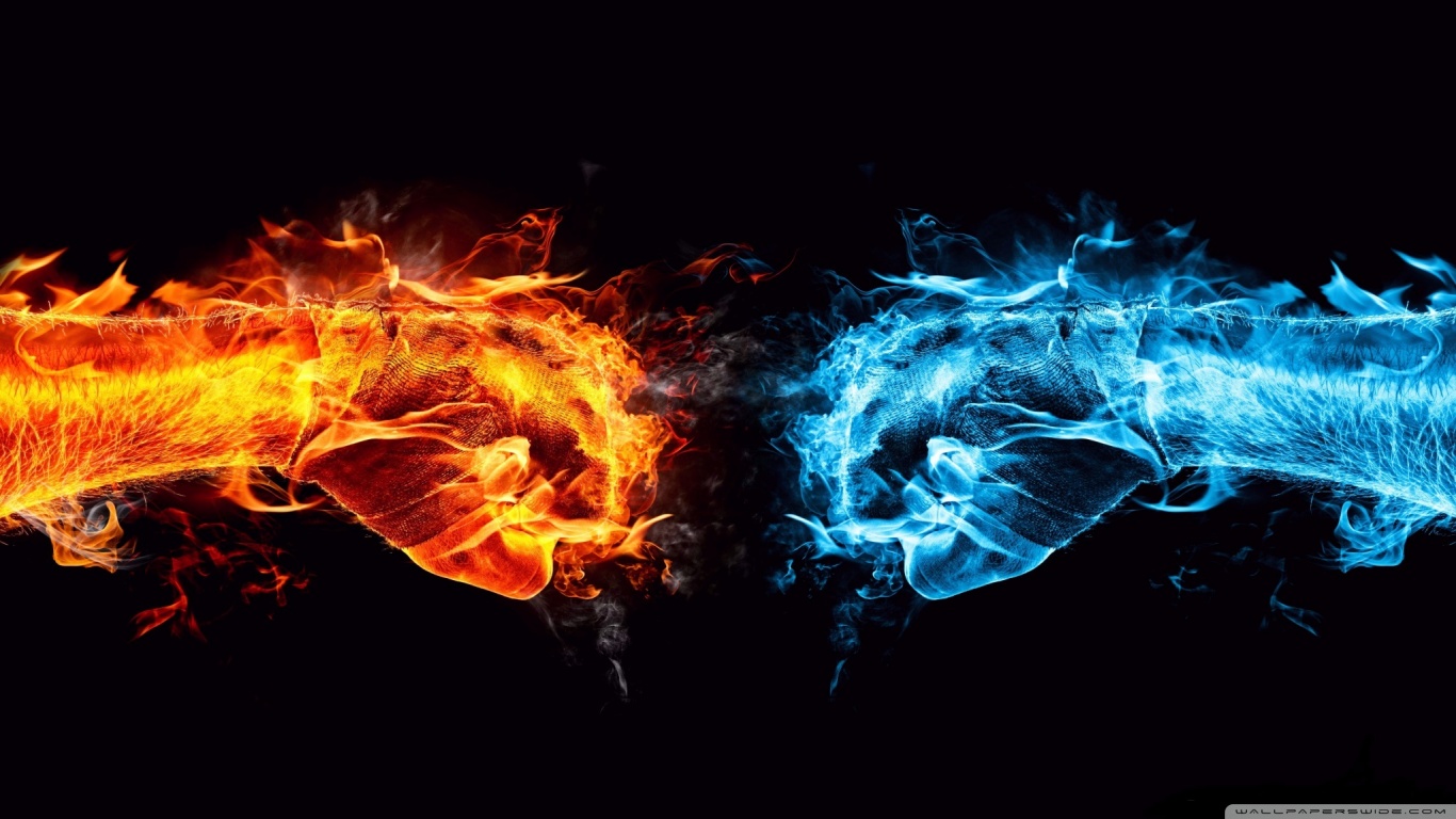 Description: Two different colored fire and ice on a black background.