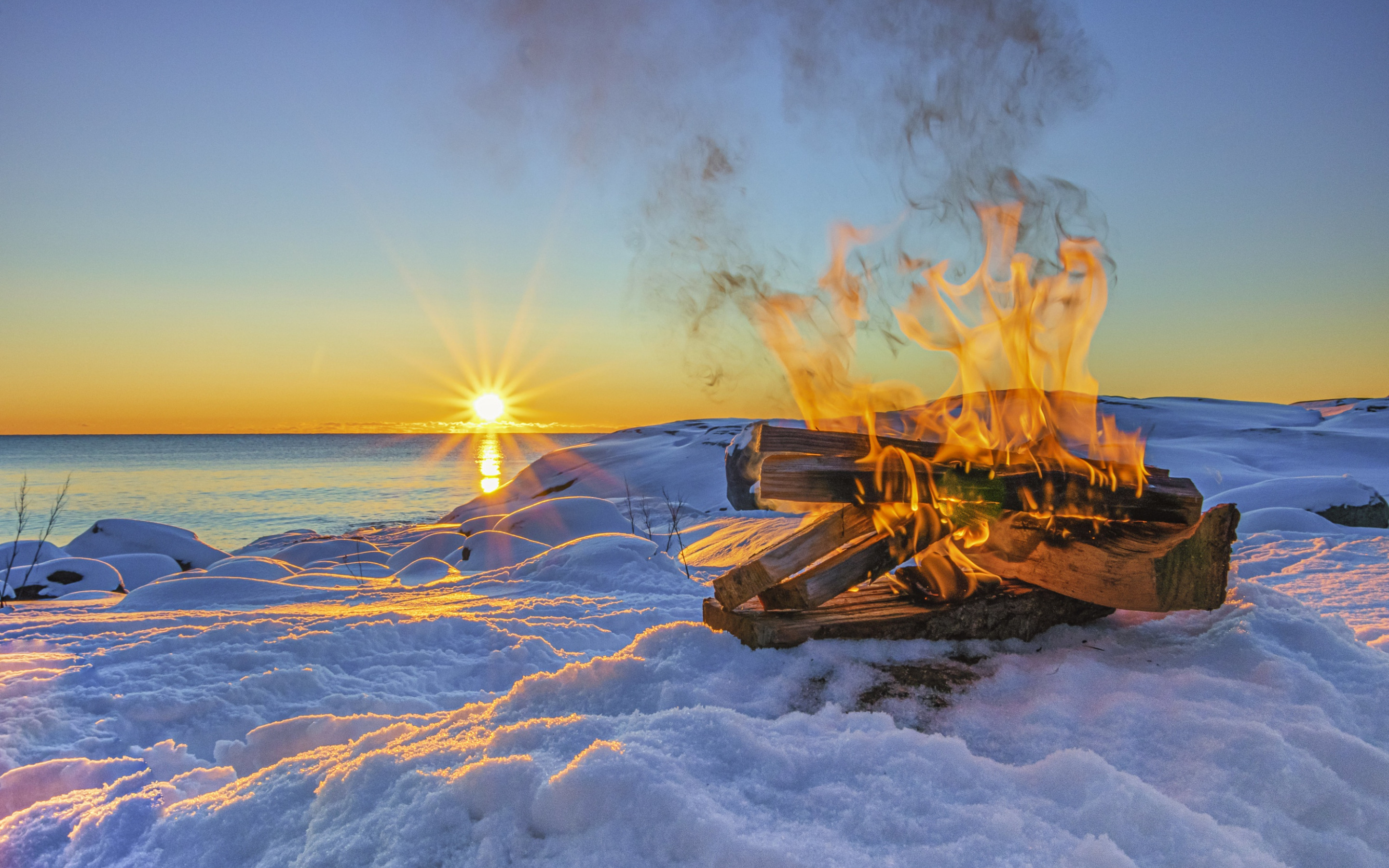 Description: A fire pit is set on a snowy surface with the sun setting in the background and the water in the foreground.
