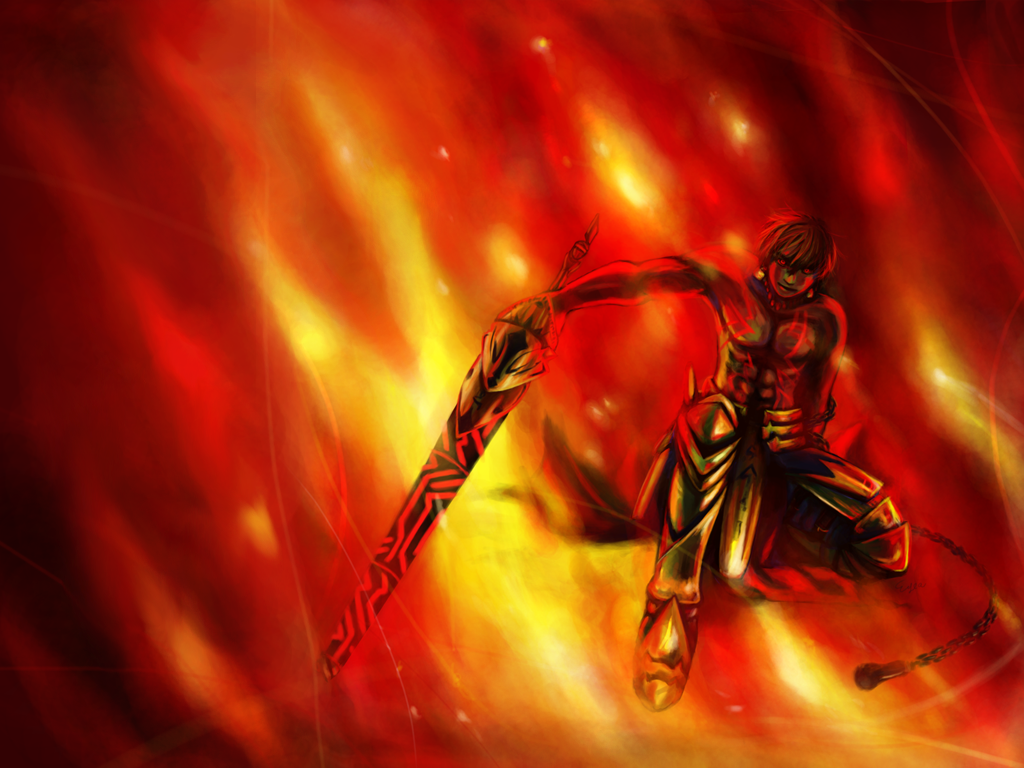 Description: A digital painting of a person in a fire suit with a sword in his hand and a fire background.