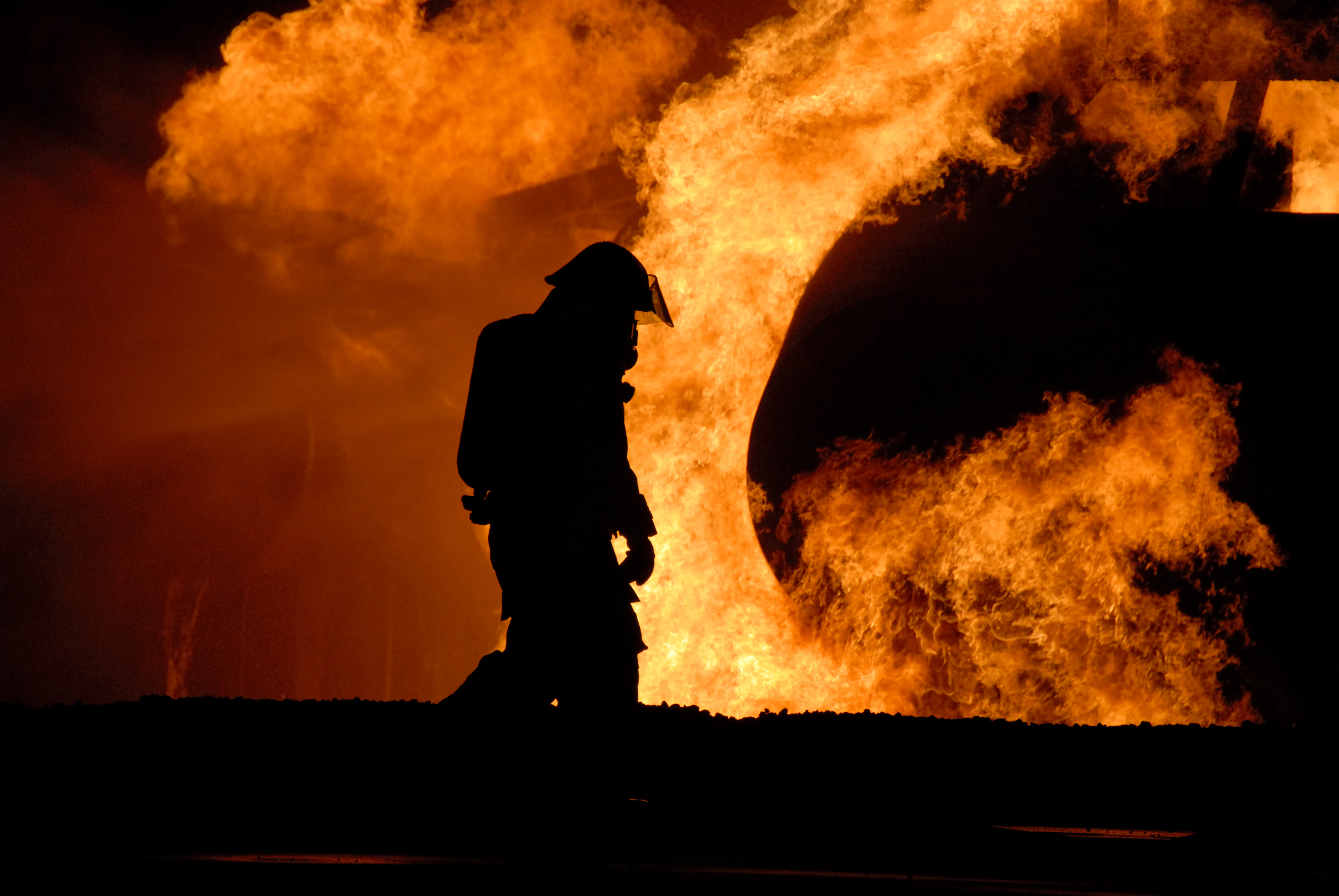 Description: A firefighter standing in front of a large fire with flames coming out of it's back and a huge fire in the background.