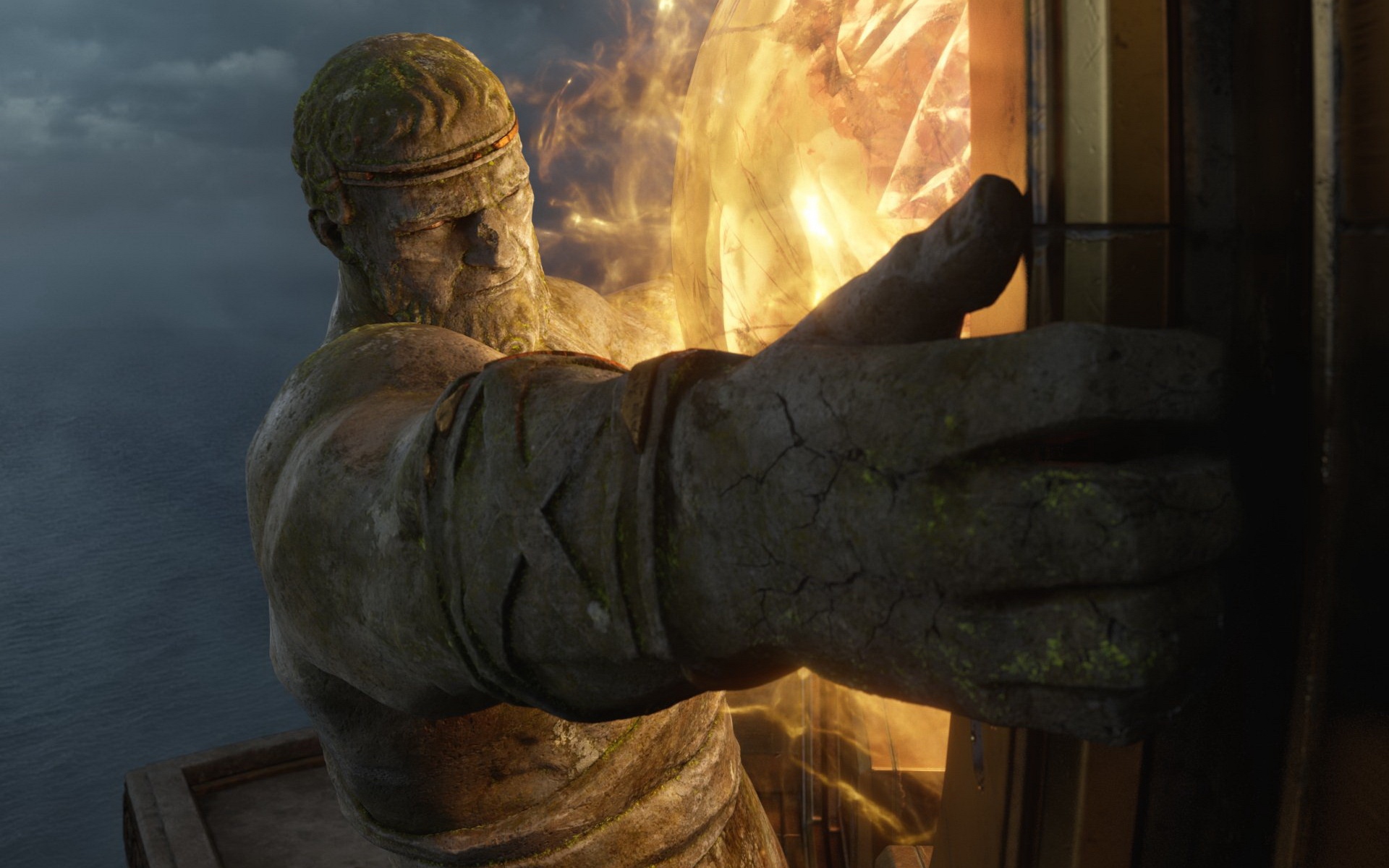 Description: A statue of a man holding a fire in his hand with a sky background and a body of water in the background.
