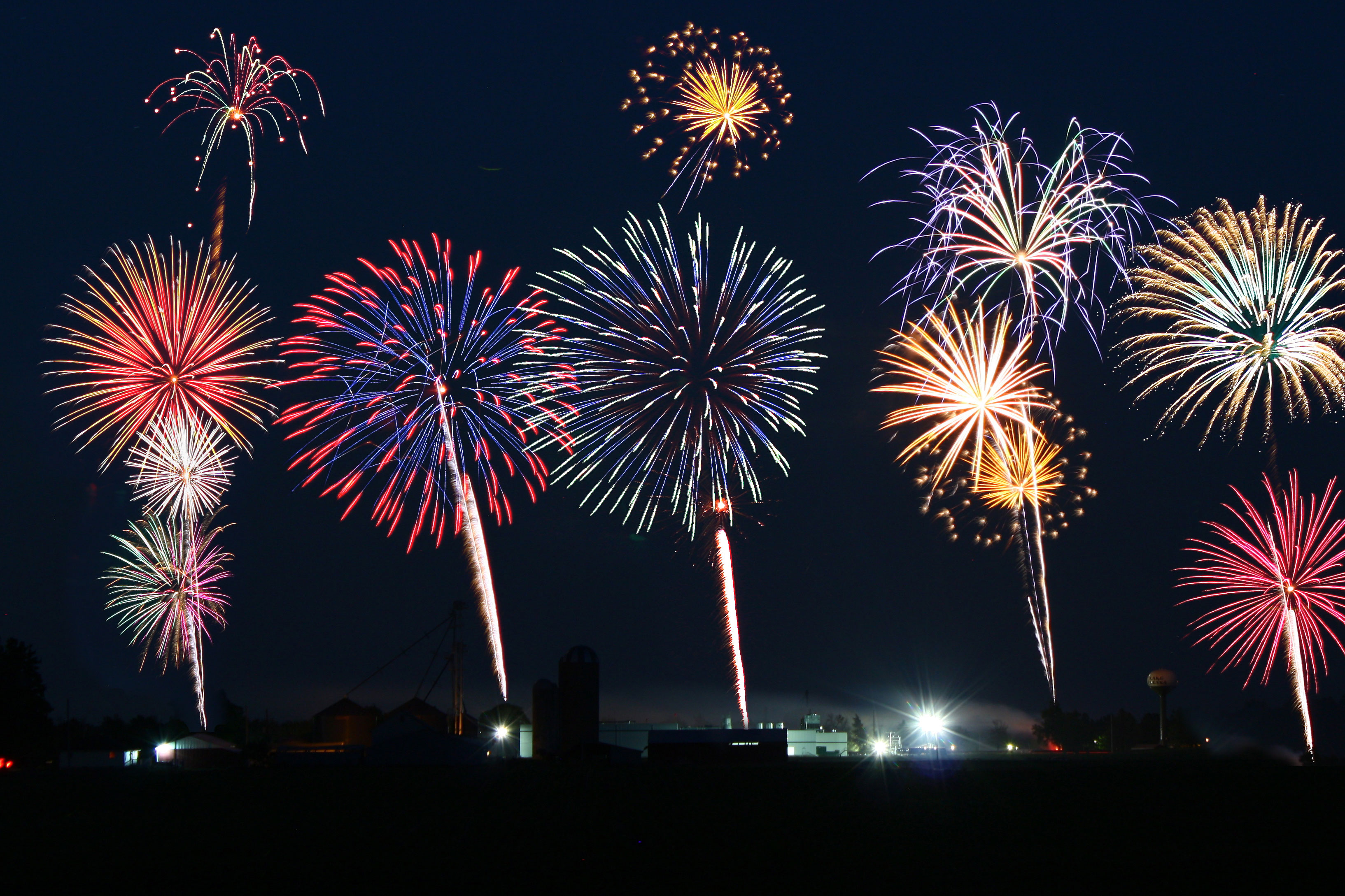 Description: A bunch of fireworks are lit up in the night sky with a city in the background and a building in the foreground.