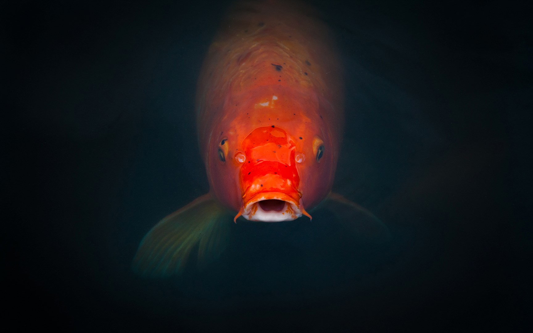 Description: A fish with a lot of bubbles in it's mouth and a black background with a light shining on it.