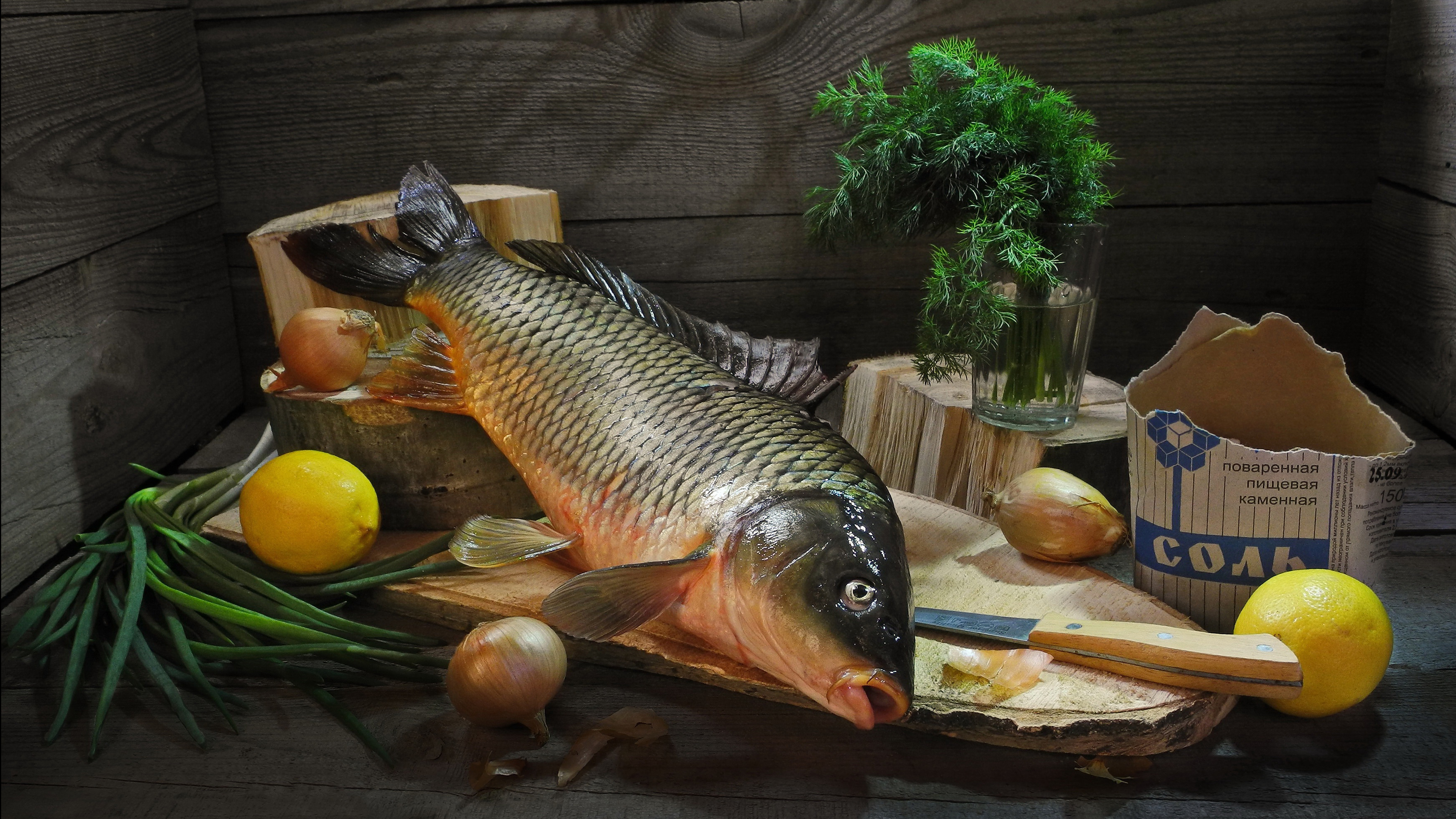 Description: A fish is on a cutting board with vegetables and other items around it on a table top with a wooden background.