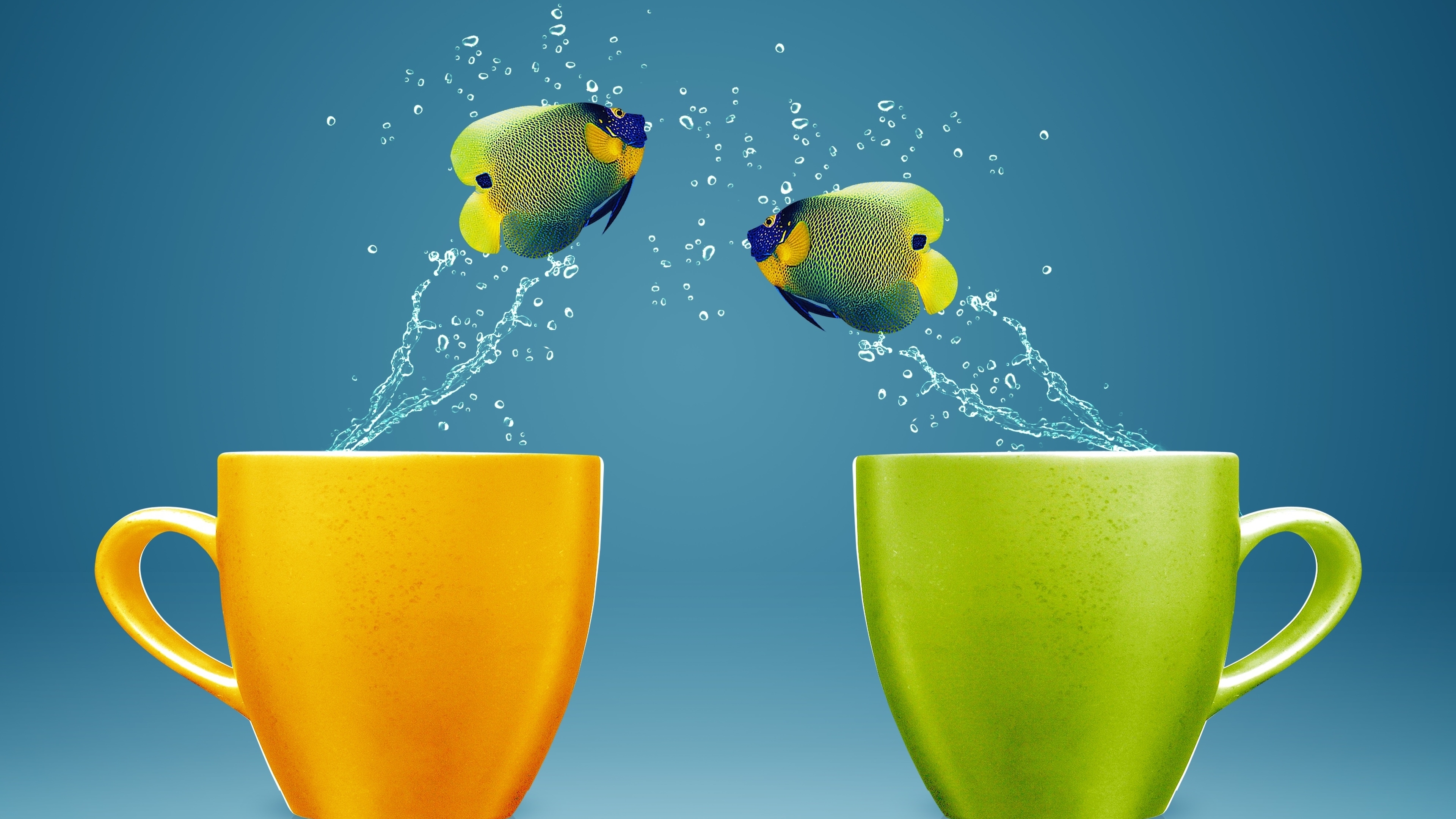 Description: Two fish are jumping out of a cup of water to another fish that is jumping out of the cup.