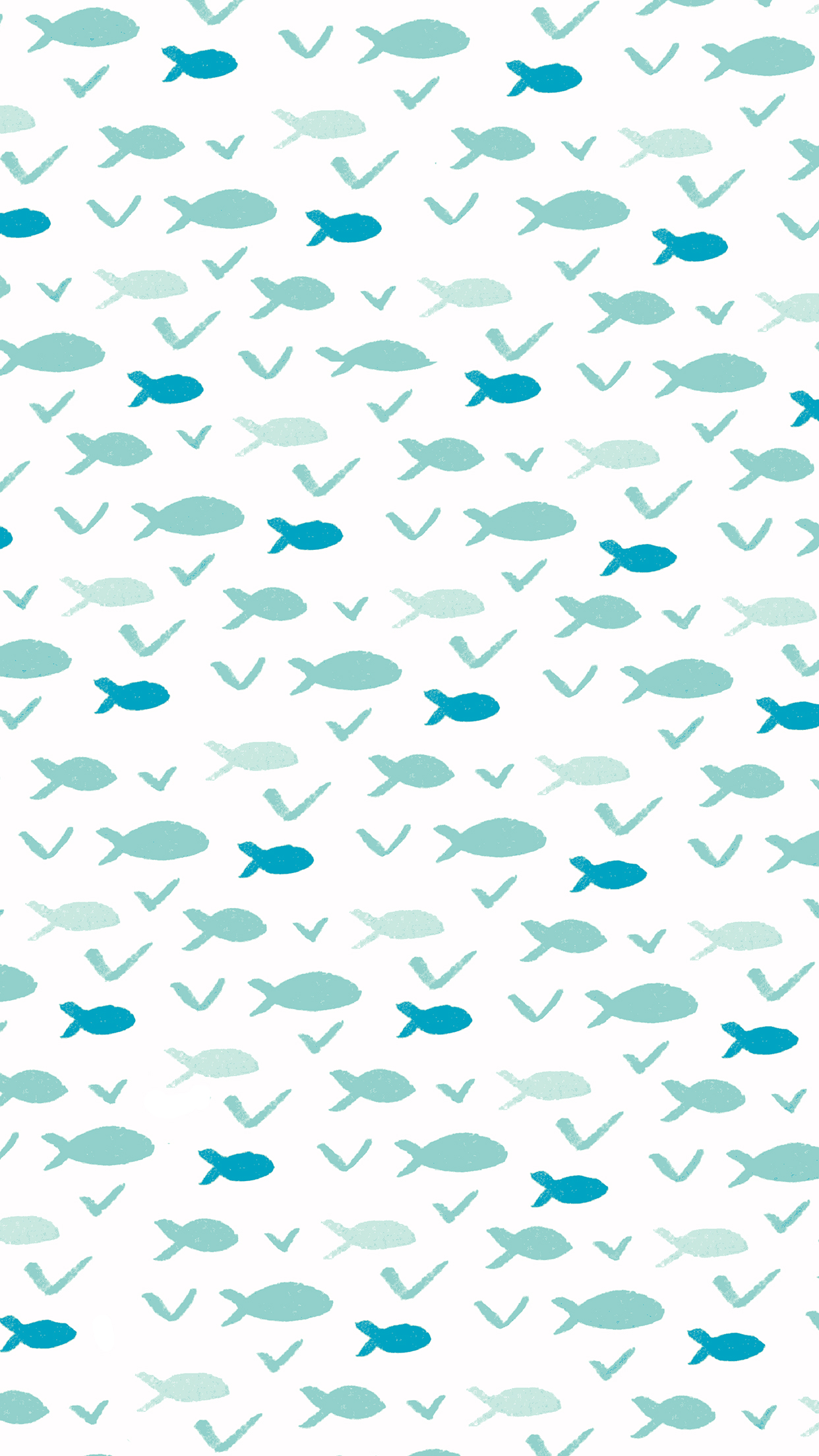 Description: A pattern of fish on a white background with blue accents on the bottom of the image and bottom of the image.