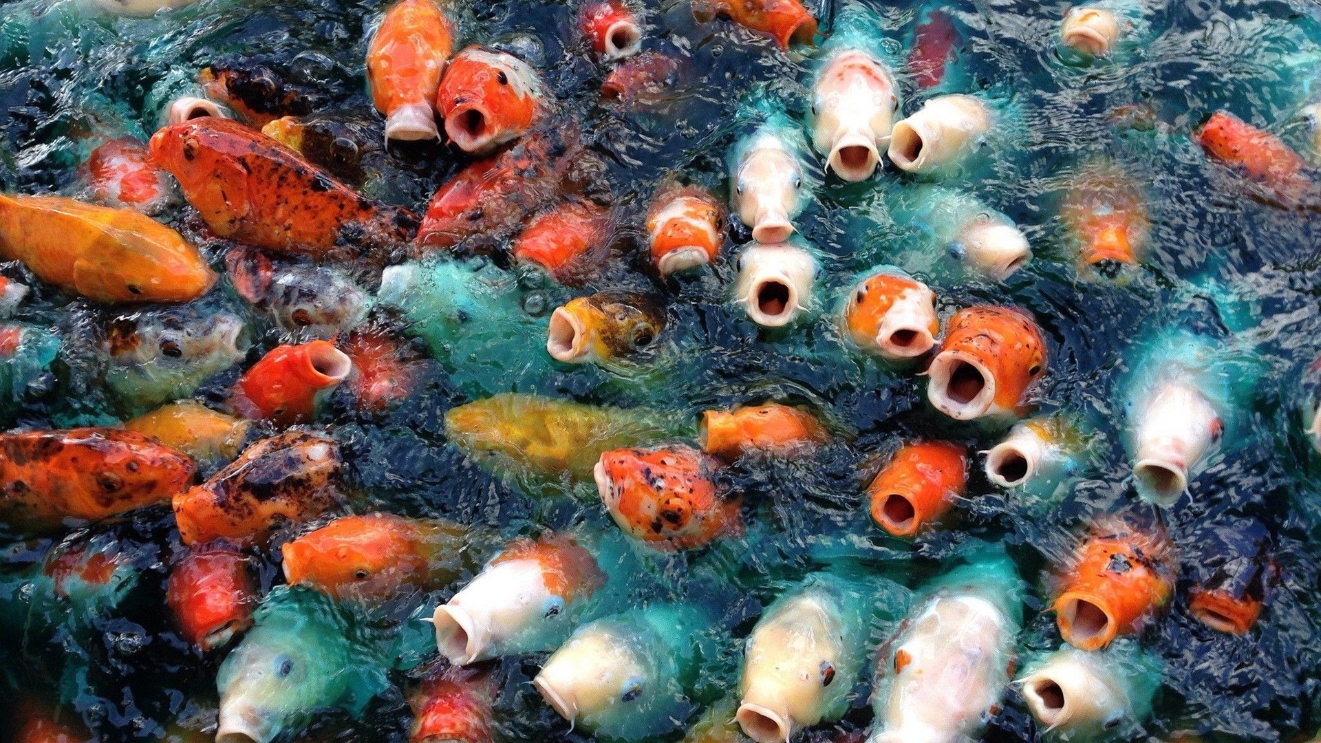 Description: A lot of fish that are in the water together and some are swimming around together in the water and some are looking at the camera.