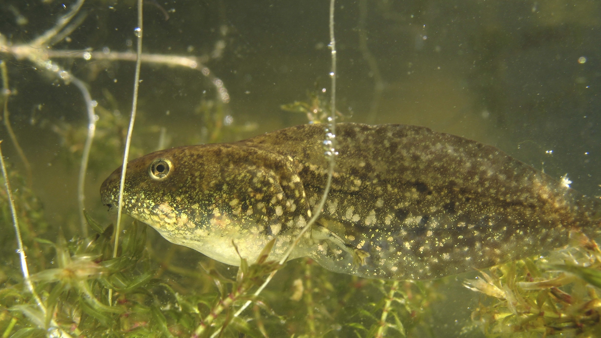 Description: A fish that is swimming in some water near some plants and grass and water droplets are on the water.