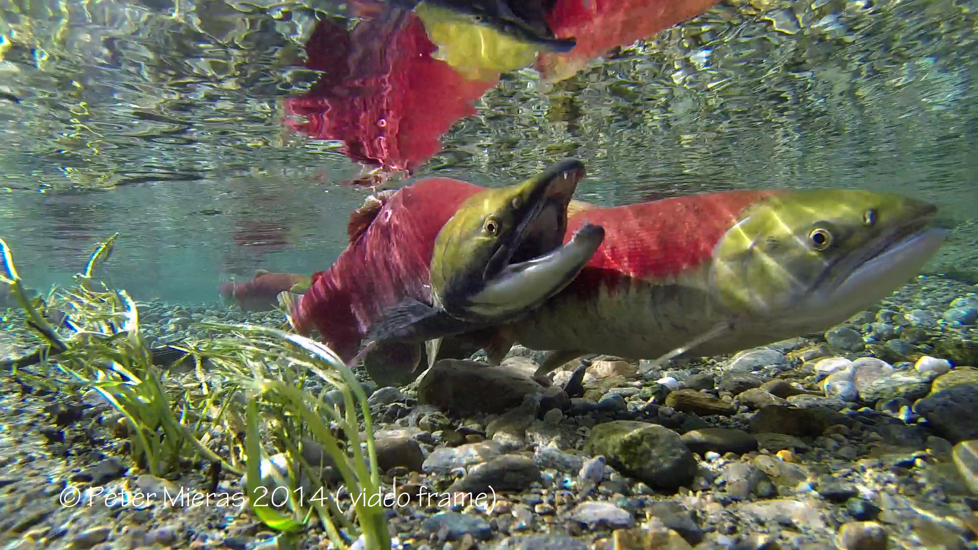 Description: A couple of fish swimming in a body of water next to rocks and grass on the ground and rocks under the water.
