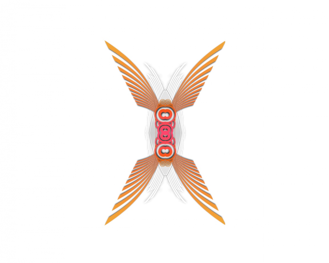 Description: A fish with two wings and a pink body with two red circles on it's back end and a white background.