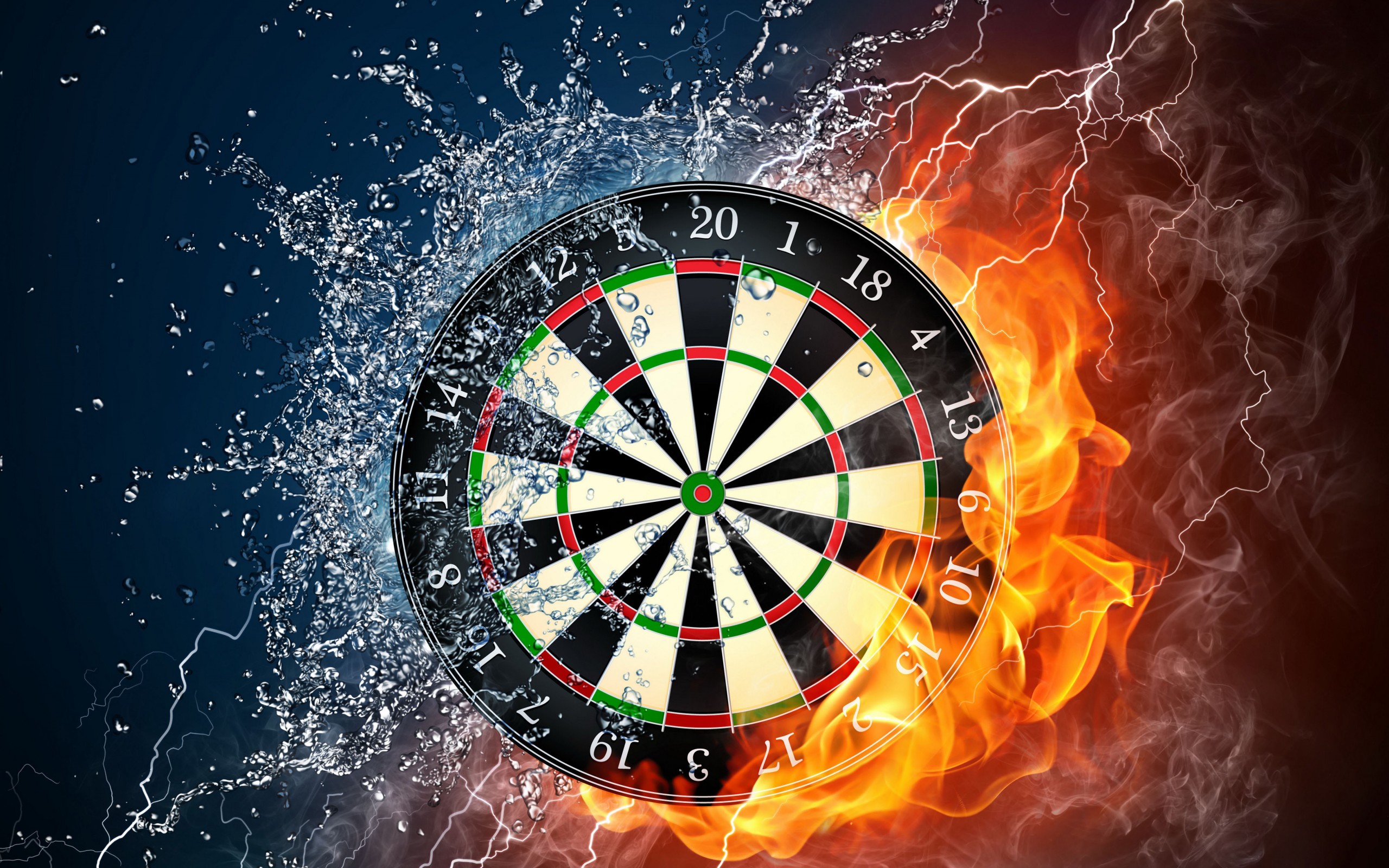 Description: A flaming flamingo with a dart in it surrounded by water and fire and lightnings on a dark background.