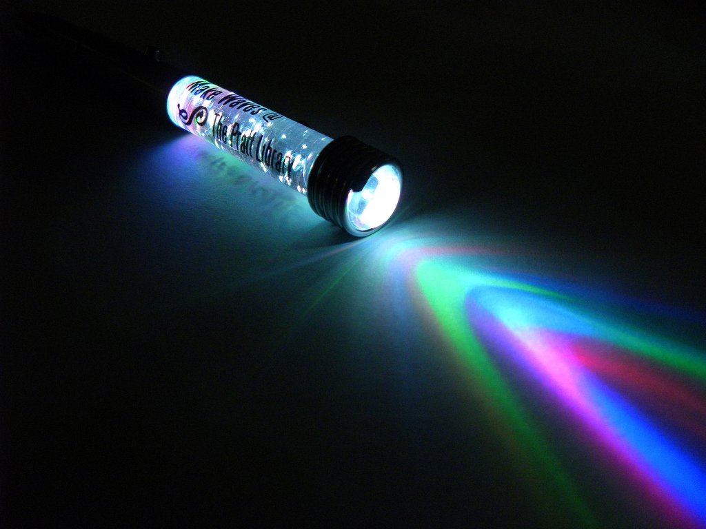 Description: A flashlight with a light shining through it on a black background with a rainbow light coming from it and a black background with a white light.