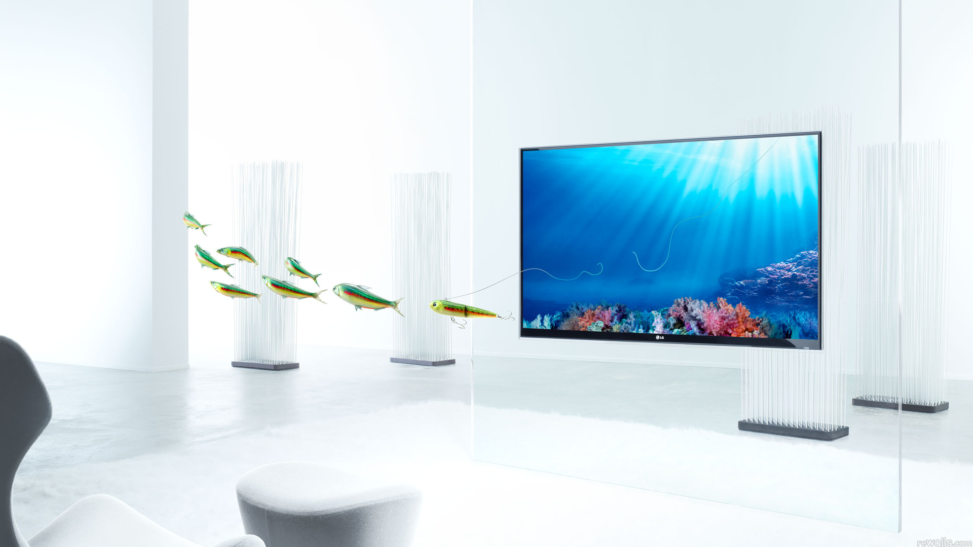 Description: A large flat screen tv sitting in a room next to a white chair and a white wall with fish on it.
