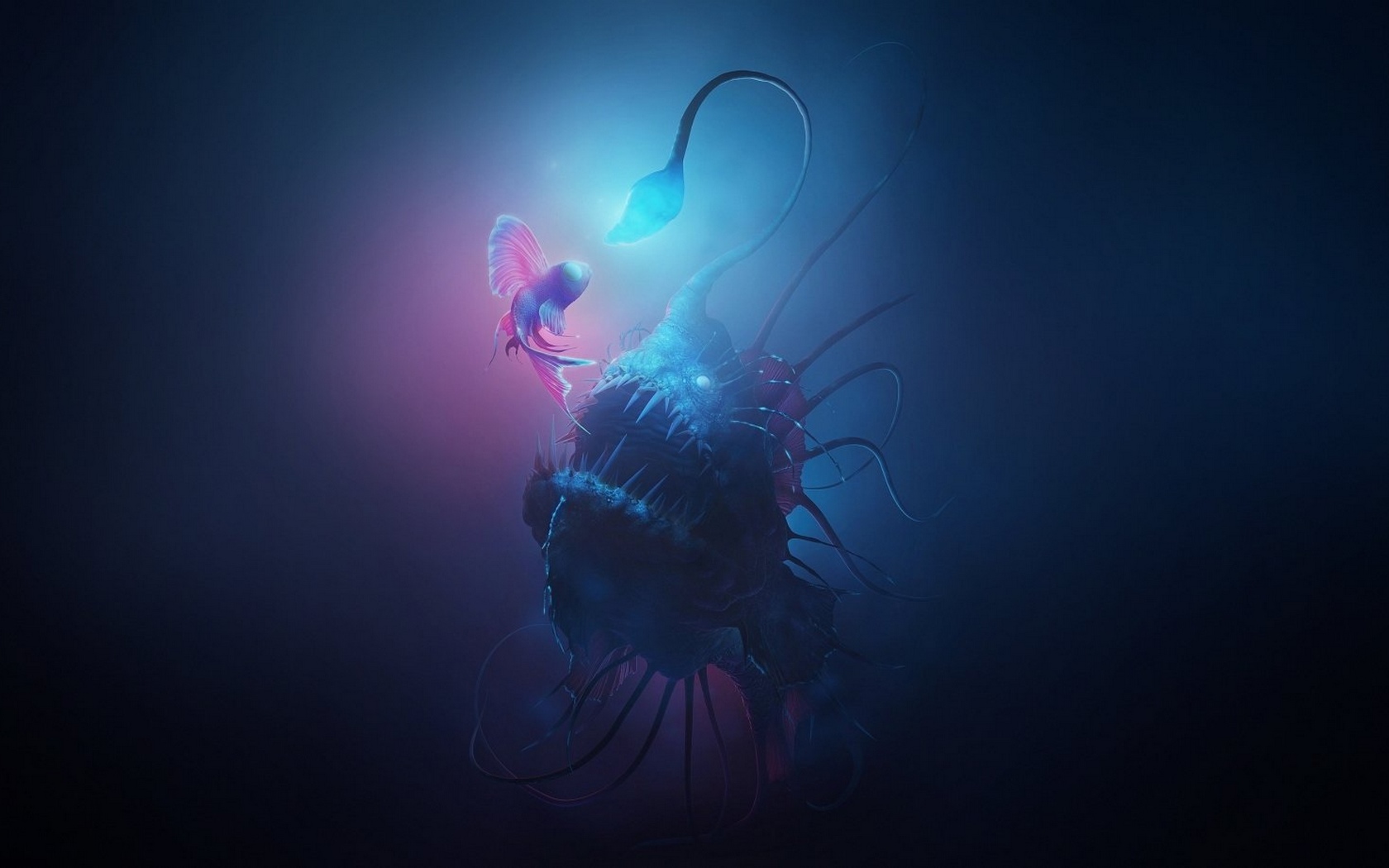 Description: A blue and purple object floating in the water with a light on it's side and a fish on its back.