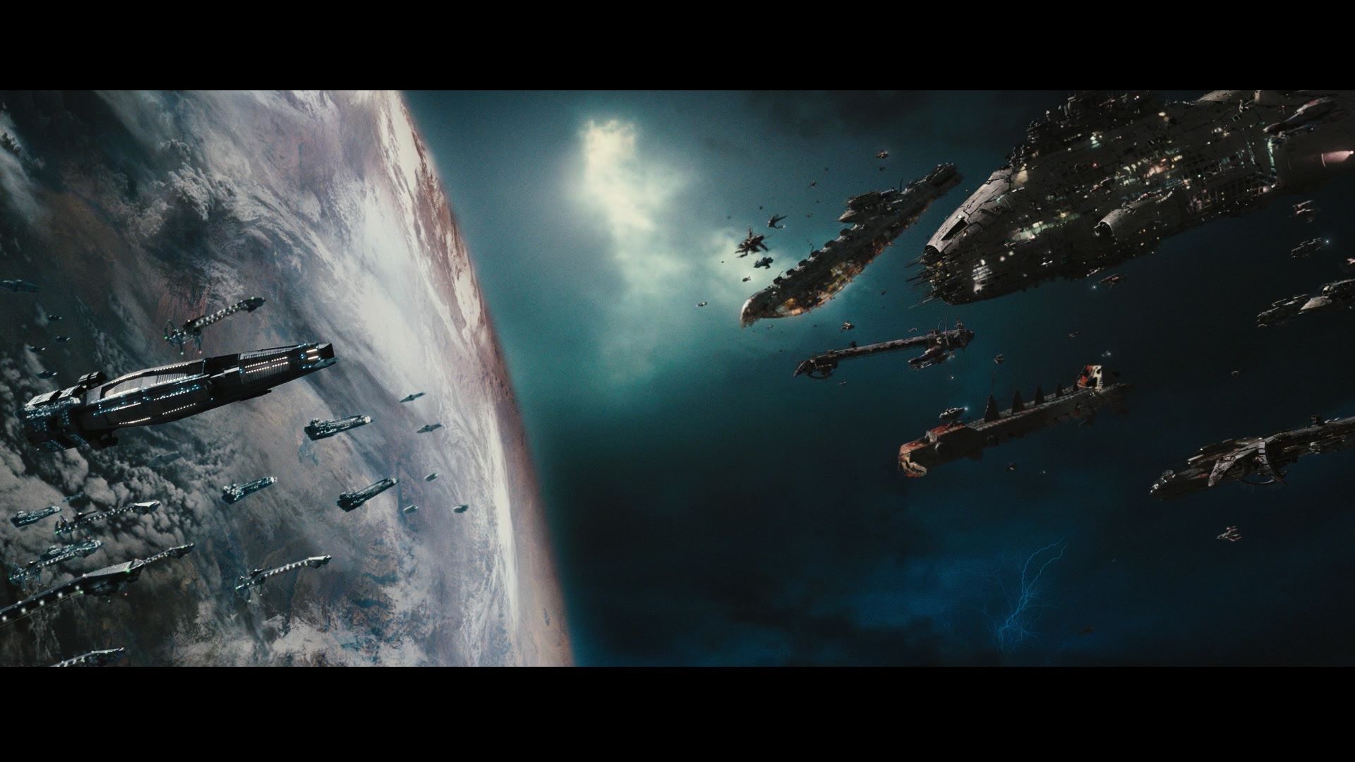Description: A group of ships floating in the air next to a planet with clouds and stars in the sky above.