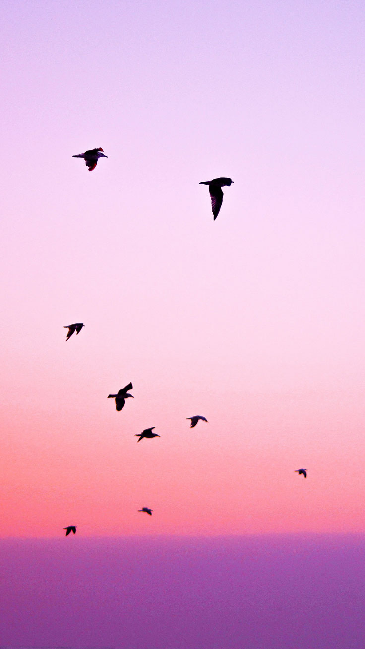 Description: A flock of birds flying in the sky at sunset or dawn or dawn or dawn or dawn or dawn.