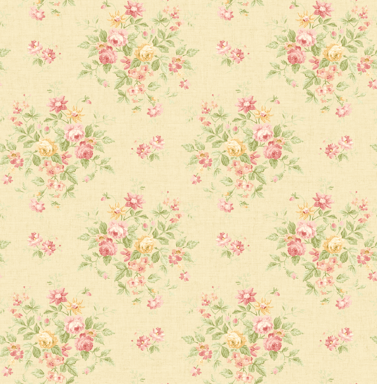 Description: A floral pattern with pink and yellow flowers on a light yellow background with green leaves and flowers on the bottom.