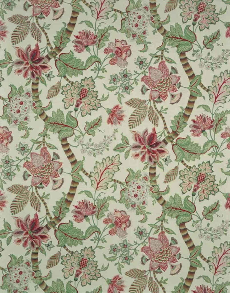 Description: A floral pattern with many flowers on a white background with green leaves and flowers on the side of the fabric.