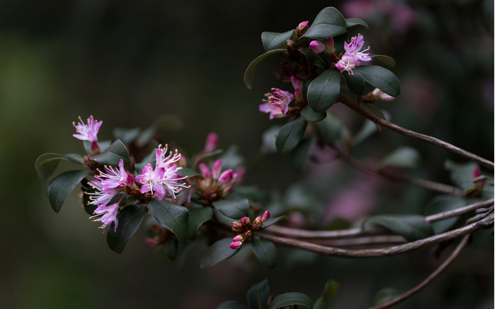 Description: A close up of a flower on a tree branch with leaves and buds in the background.