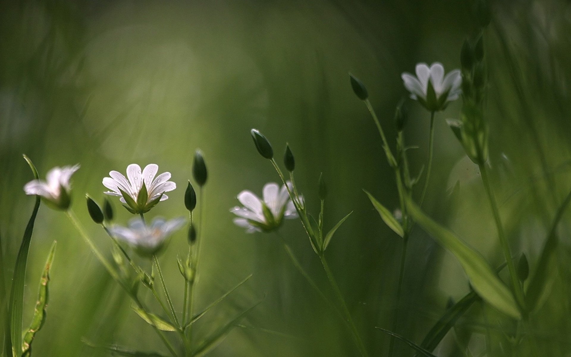 Description: A close up of a flower in a field of grass with a blurry background of grass and flowers.
