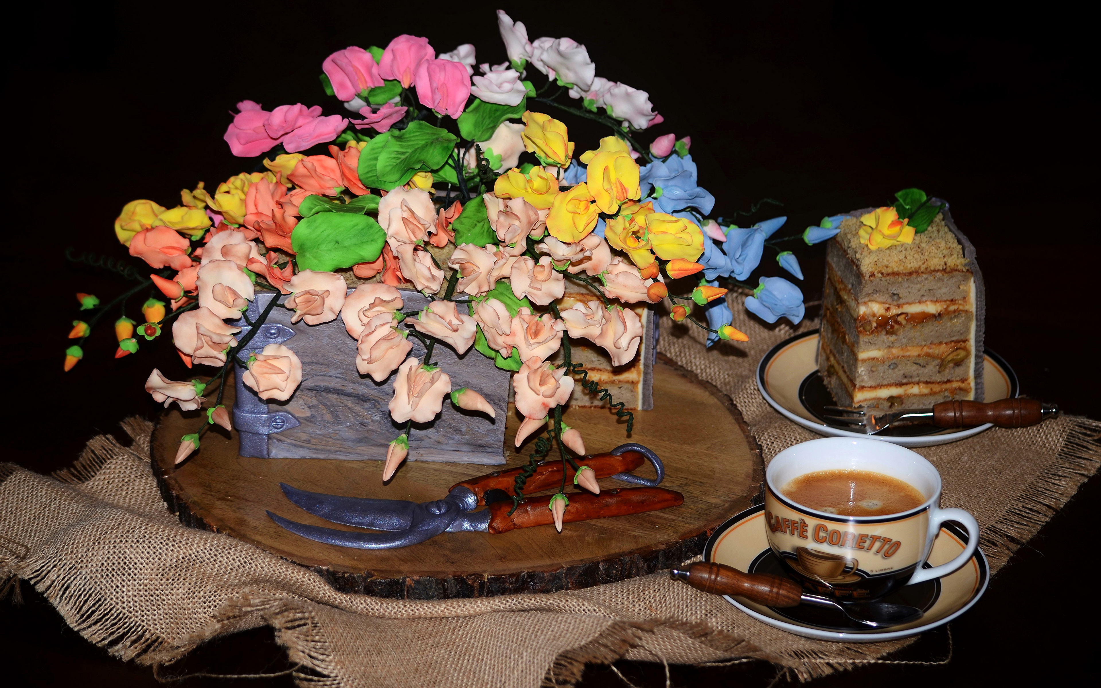 Description: A cake with flowers on it and a cup of coffee on a table with a plate of cake and a mug of coffee.