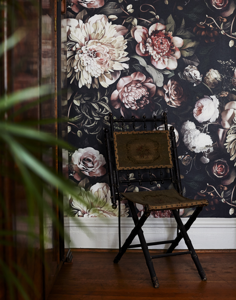 Description: A chair sitting in front of a wall with a flower pattern on it and a plant in the corner.